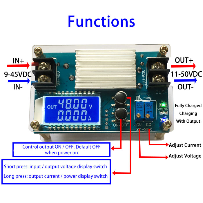 - Output can be switched off via buttons. Due to special boost architecture, after traditional boost module is turned off, output voltage is input voltage. This product overcomes this problem.