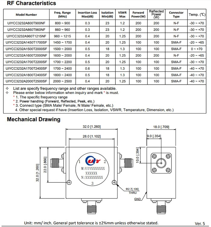 UIYCC3232A Coaxial Circulator Microwave RF Circulator with 800-900MHz Range and Optional Connectors