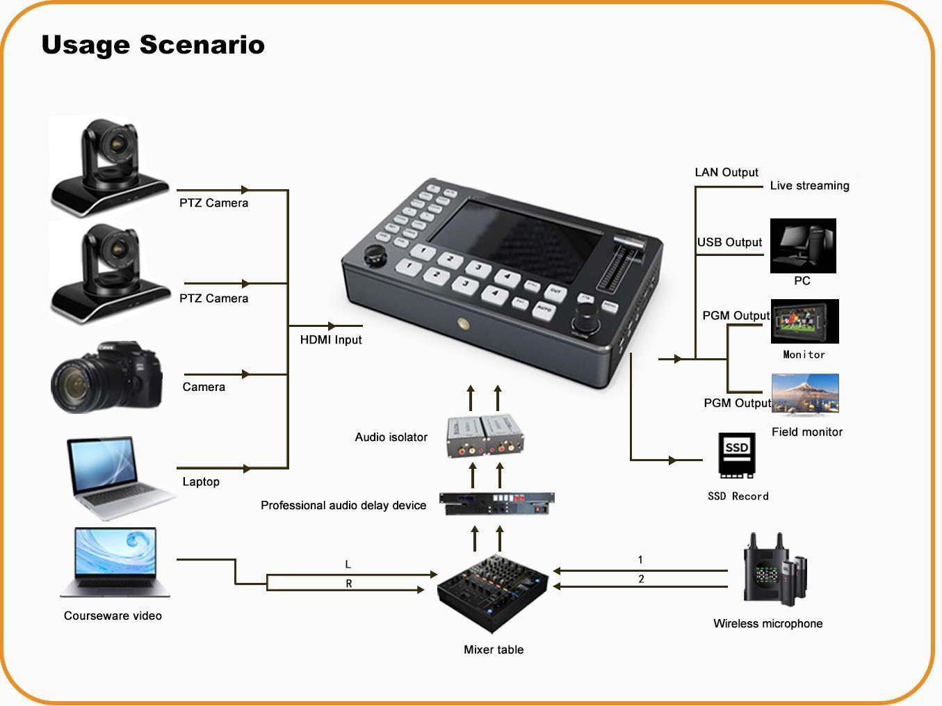 - Audio: HDMI x 4 and MIC/ Line level x 2; Audio delay: 0-5s