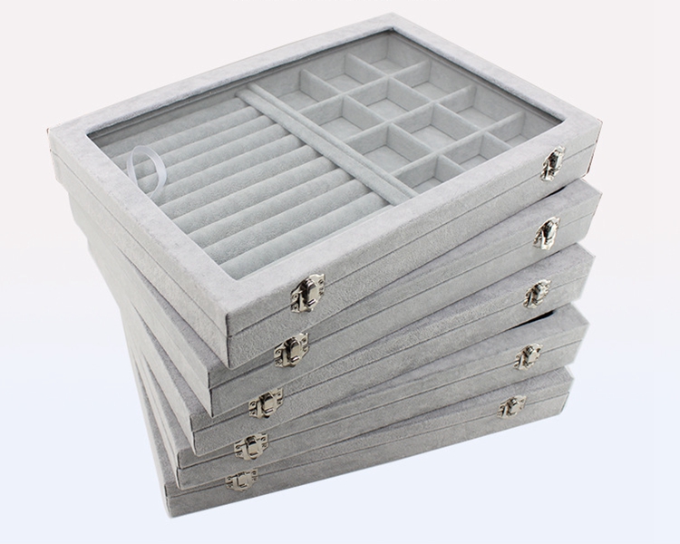 L Jewelry Display Tray Jewelry Display Case Earrings Rings Velvet Organizer Clear Glass Lid +12Grids