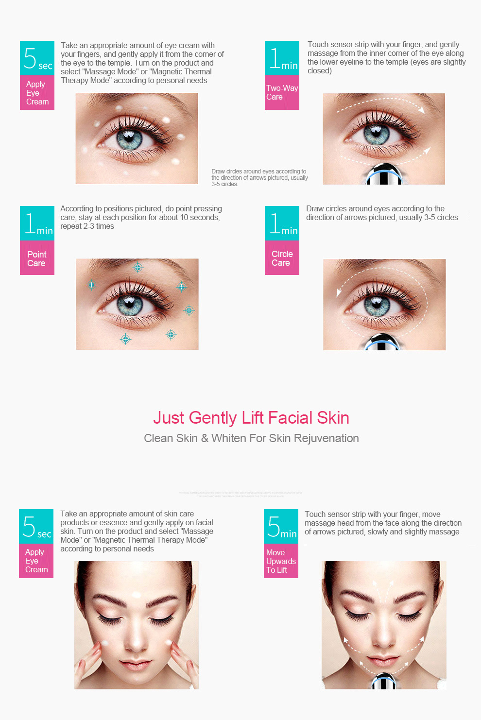 - High-frequency oscillation technology accelerates microcirculation. There is a built-in high frequency oscillator in the eye beauty instrument, which generates 140 high frequency vibrations per second, allowing the effective ingredients to be quickly transmitted between cells, nourishing every cell around the eyes, regaining luster and reducing fine lines. Microseismic waves can accelerate the skin microcirculation and the tiny blood vessels to bring more nutrient lymph and take away accumulated toxins.