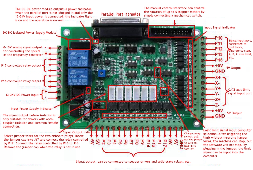 - The CNC six axis port board (Ver3.4) has been optimized to meet the requirements of connecting CNC software through computer parallel ports, controlling CNC equipment, and mutual I/O functions. The use of an onboard DC-DC isolated power supply ensures complete isolation of the optocoupler's front and rear circuits even when powered by a single power source (DC 12V-24V). Surface mount components are commonly used, and large-area grounding and copper-clad PCB designs are employed to ensure the electrical stability of the product. The interface board uses connectors for input and output connections, making installation and use more convenient.