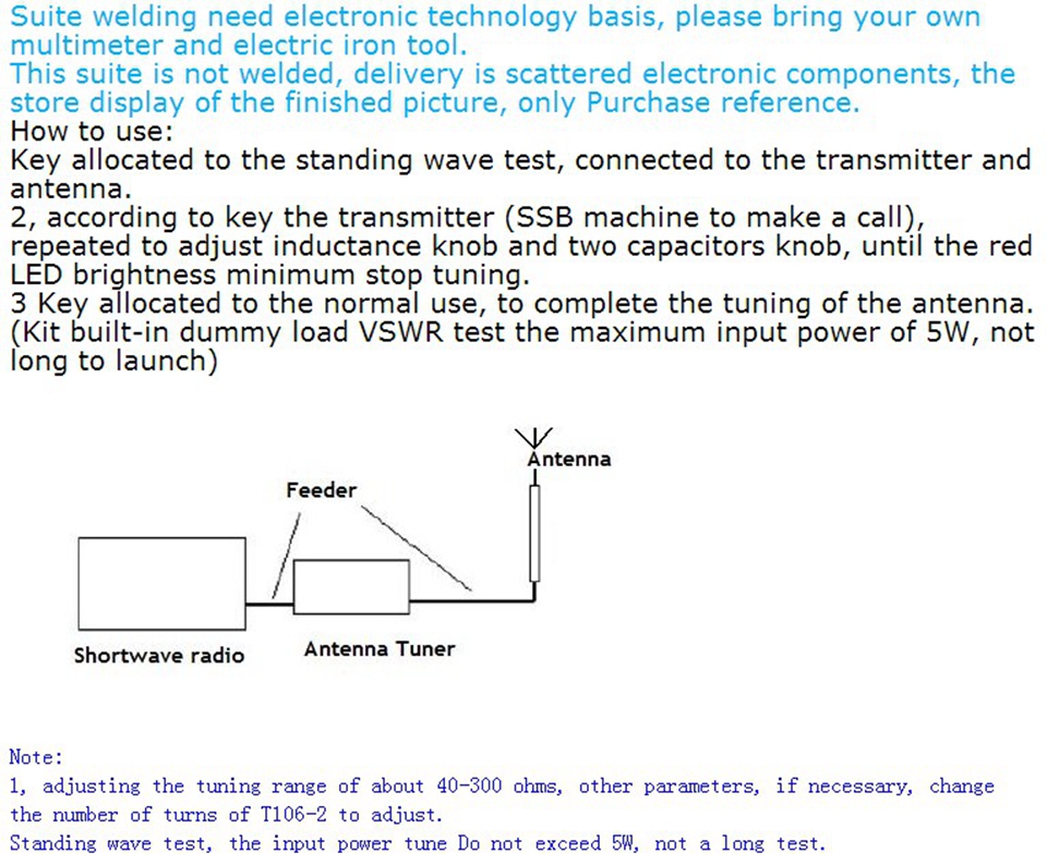 - This antenna tuner kit comes with a standing wave indicator and adopts a T-shaped topology network. It operates at shortwave 1-30MHz and can withstand a transmission power of 15W. The tuning range is about 40-300 ohms, making it very convenient for QRP communication, ensuring efficient radio transceiver communication, and also allowing you to fully enjoy the fun of DIY.