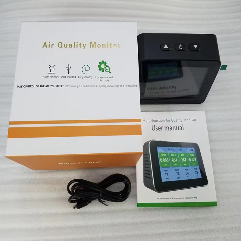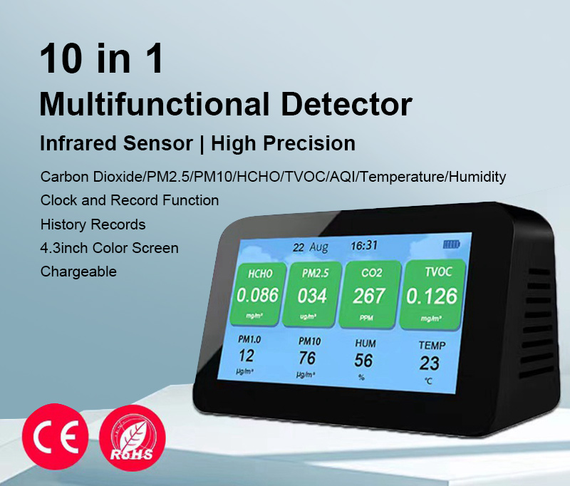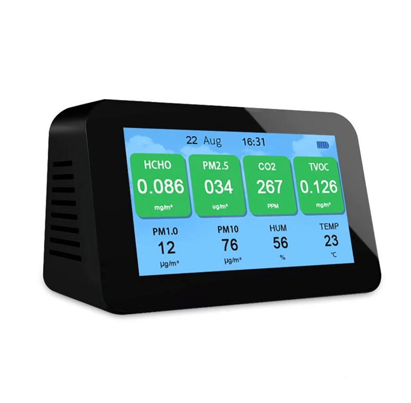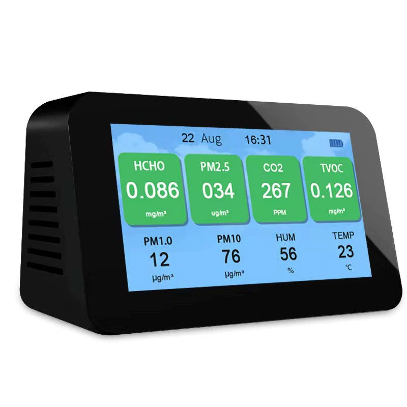 - This product is a multifunctional air quality detector that detects Carbon dioxide (CO2), Formaldehyde (HCHO), Total Volatile Organic Compounds (TVOC), Particulate Matter < 2.5 micron-sized particles (PM2.5/1.0/10), Temperature, and Humidity with clock and record function. As a scientific air quality detection device, it combines multiple air sensors with built-in fan to allow real-time monitoring of Carbon dioxide (CO2), formaldehyde (HCHO), total volatile organic compounds (TVOC), PM2.5/1.0/10, temperature, and humidity on its digital LCD display.