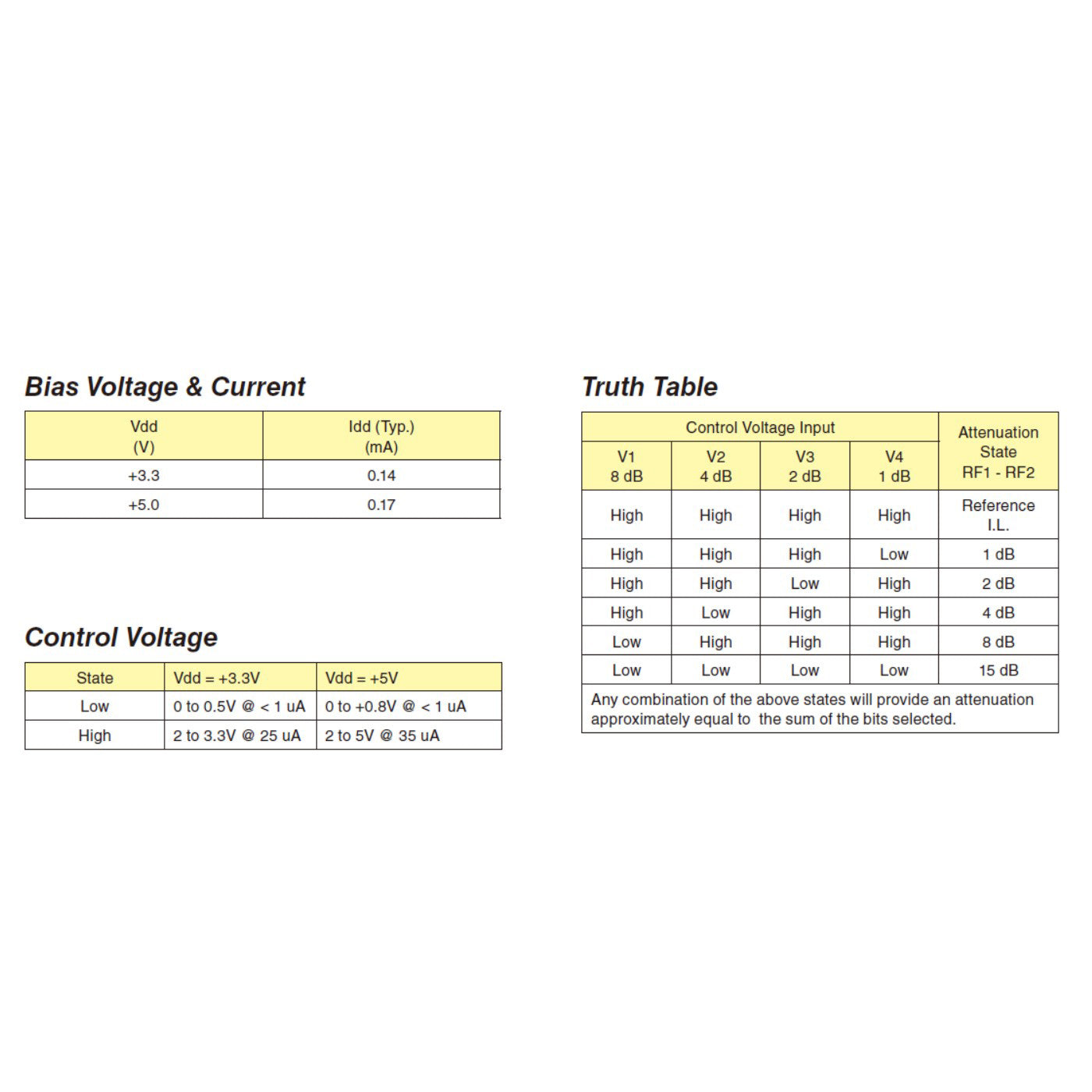 The HMC540SLP3E is a broadband 4-bit IC chip digital attenuator in a low cost leadless surface mount package. This digital attenuator for each single positive voltage control line operates off-chip with an off-chip AC grounding capacitor, making it ideal for a wide range of RF and IF applications. Operating at 0.1 to 8 GHz, the insertion loss is less than 1 dB typical. The attenuator bit values are 1 (LSB), 2, 4, and 8 dB for a total attenuation of 15 dB. It has excellent attenuation accuracy with a typical step accuracy of ± 0.2 dB. The attenuator also has +56 dBm IP3. A four-bit TTL/CMOS control input is used to select each attenuation state. It can be powered by a single supply Vdd of +3.3V to 5V.