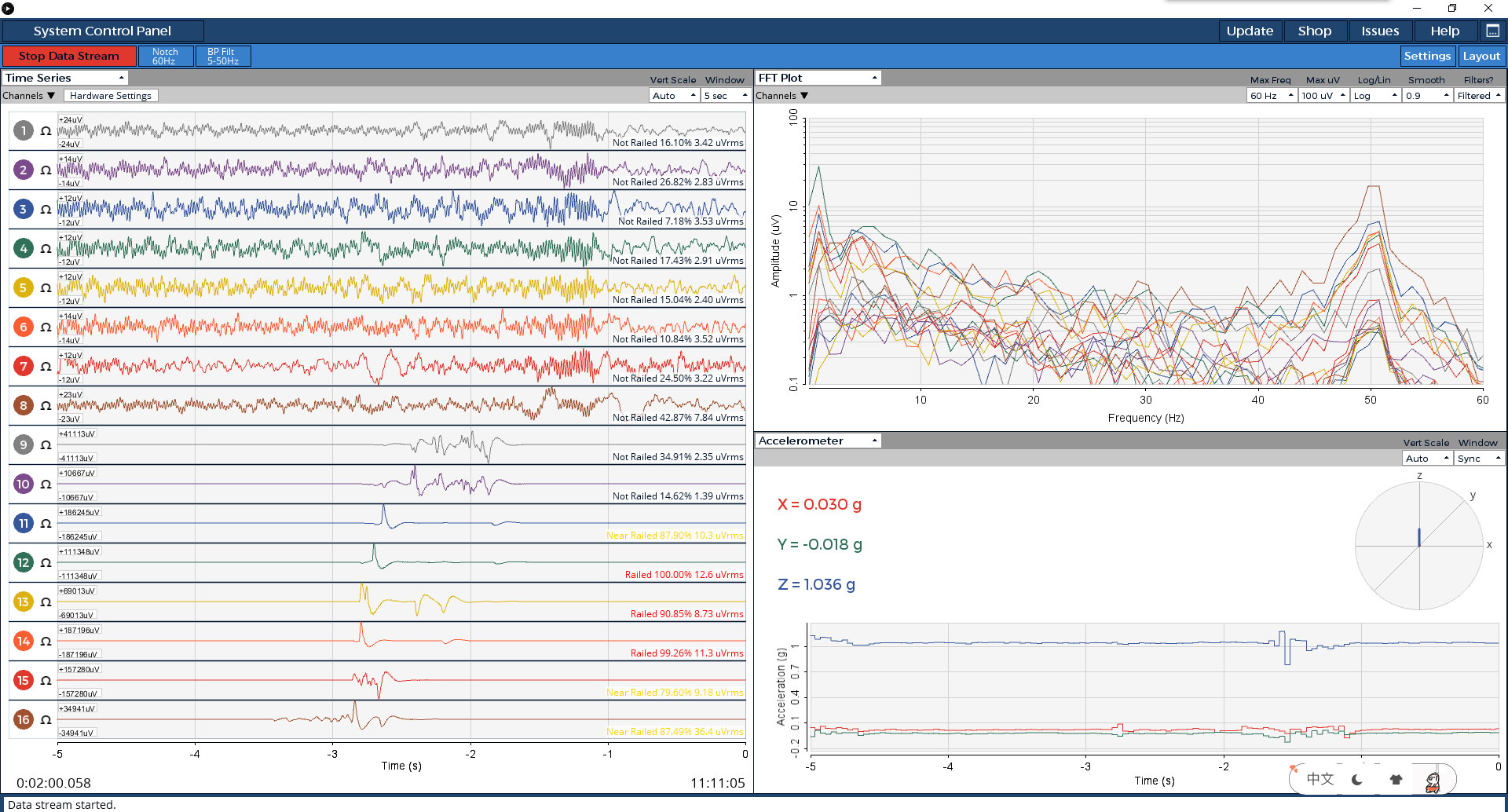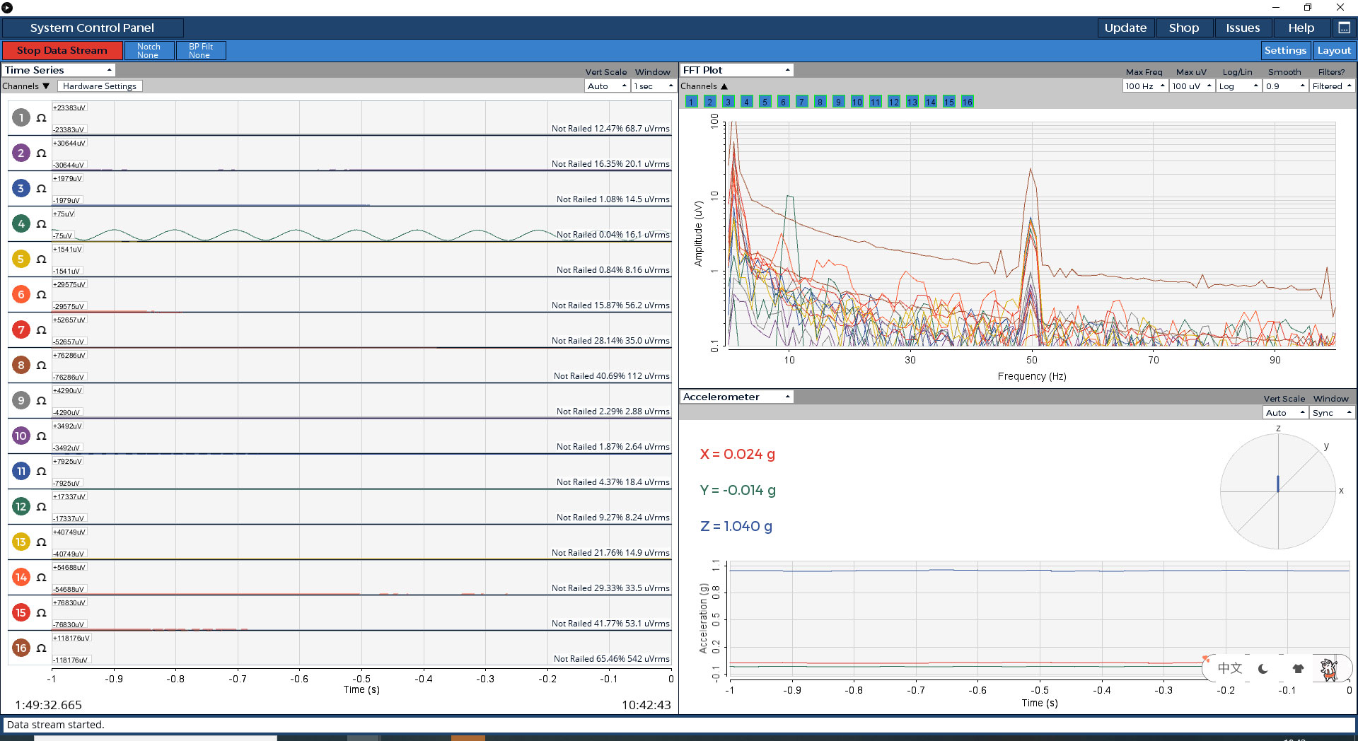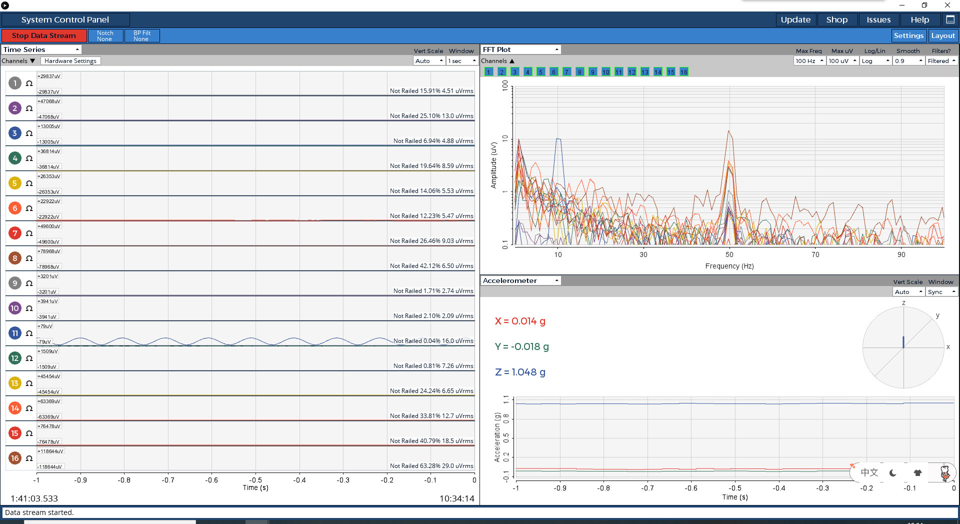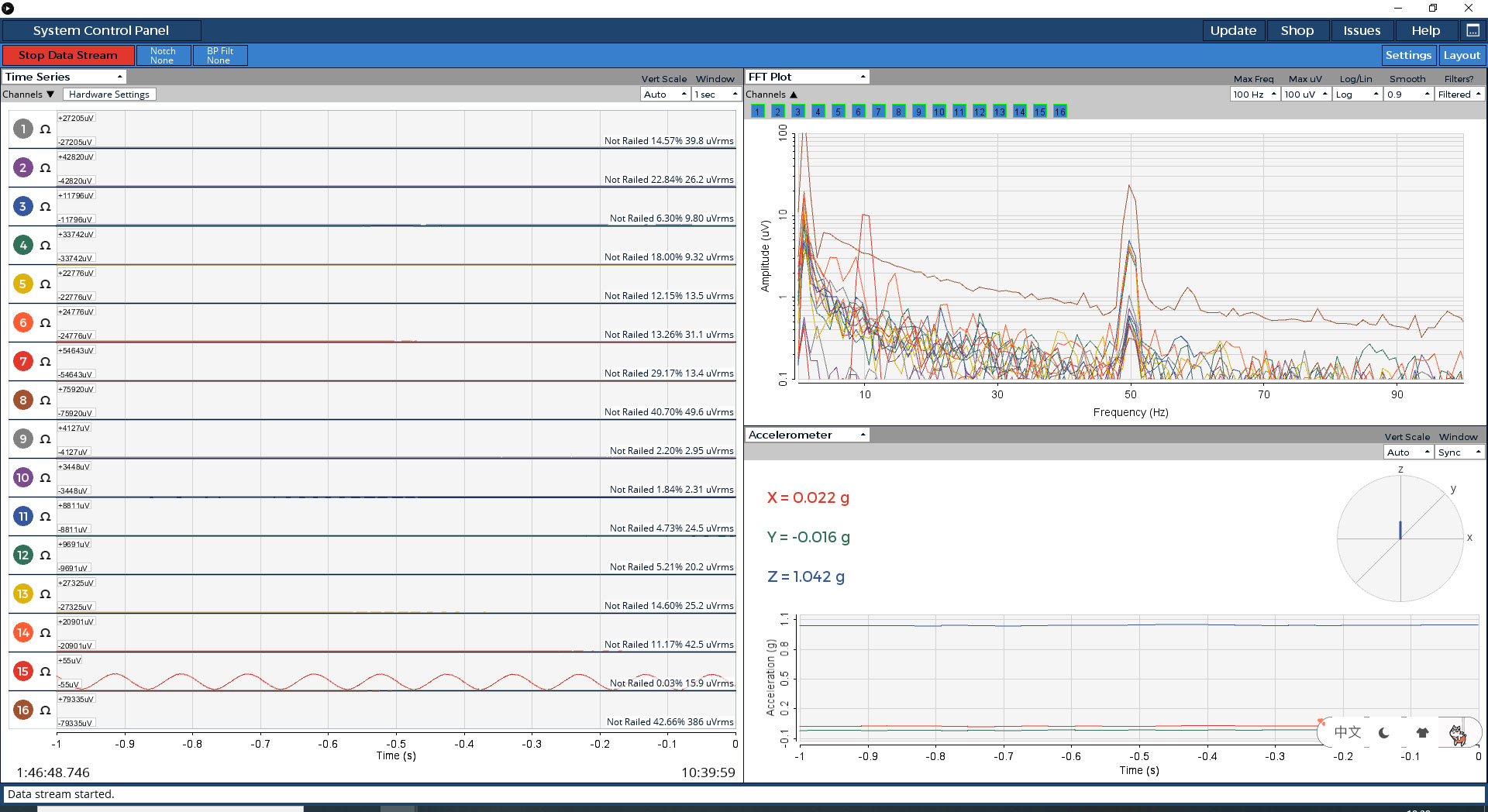 When the 16-channel acquisition board is connected, select WiFi, 16-channel, and 1K sampling rate