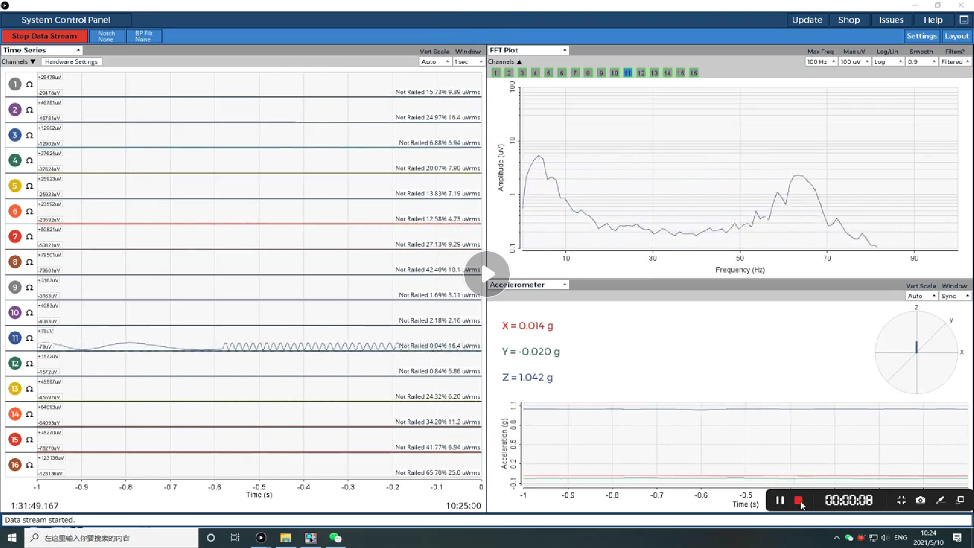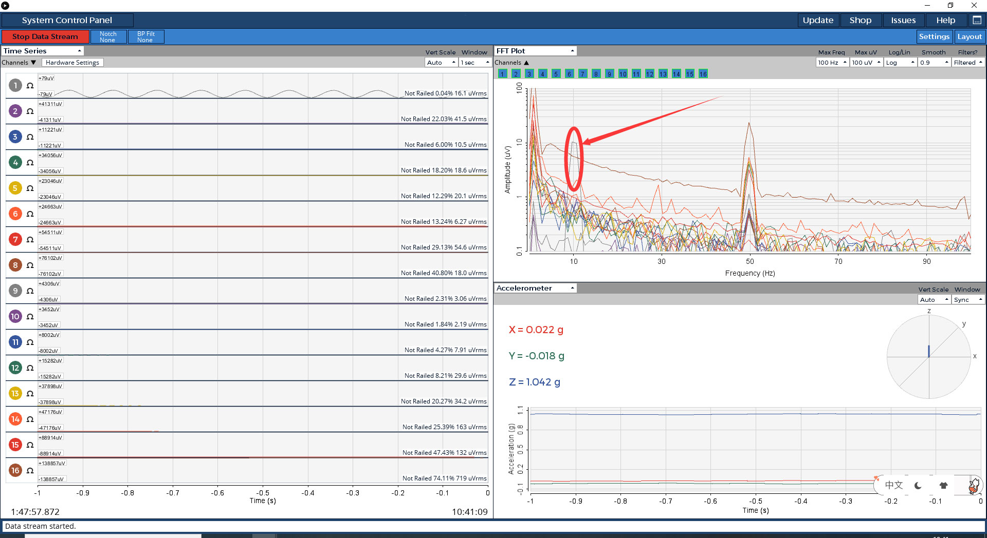 A 10Hz, 50uV test signal was generated with a self-made EEG development signal generator, and the correct results were observed in the time domain waveform and frequency domain spectrum when channel 1 was connected