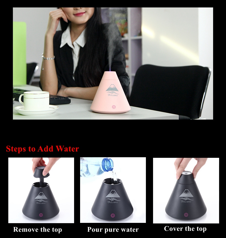 The idea of volcanic humidifier comes from volcanos. The scene of the volcanic eruption era is magnificent. It looks like a volcano. The water is added directly from the top. When working, the water vapor is sprayed out from the top, and the special effects of light are magnificent.