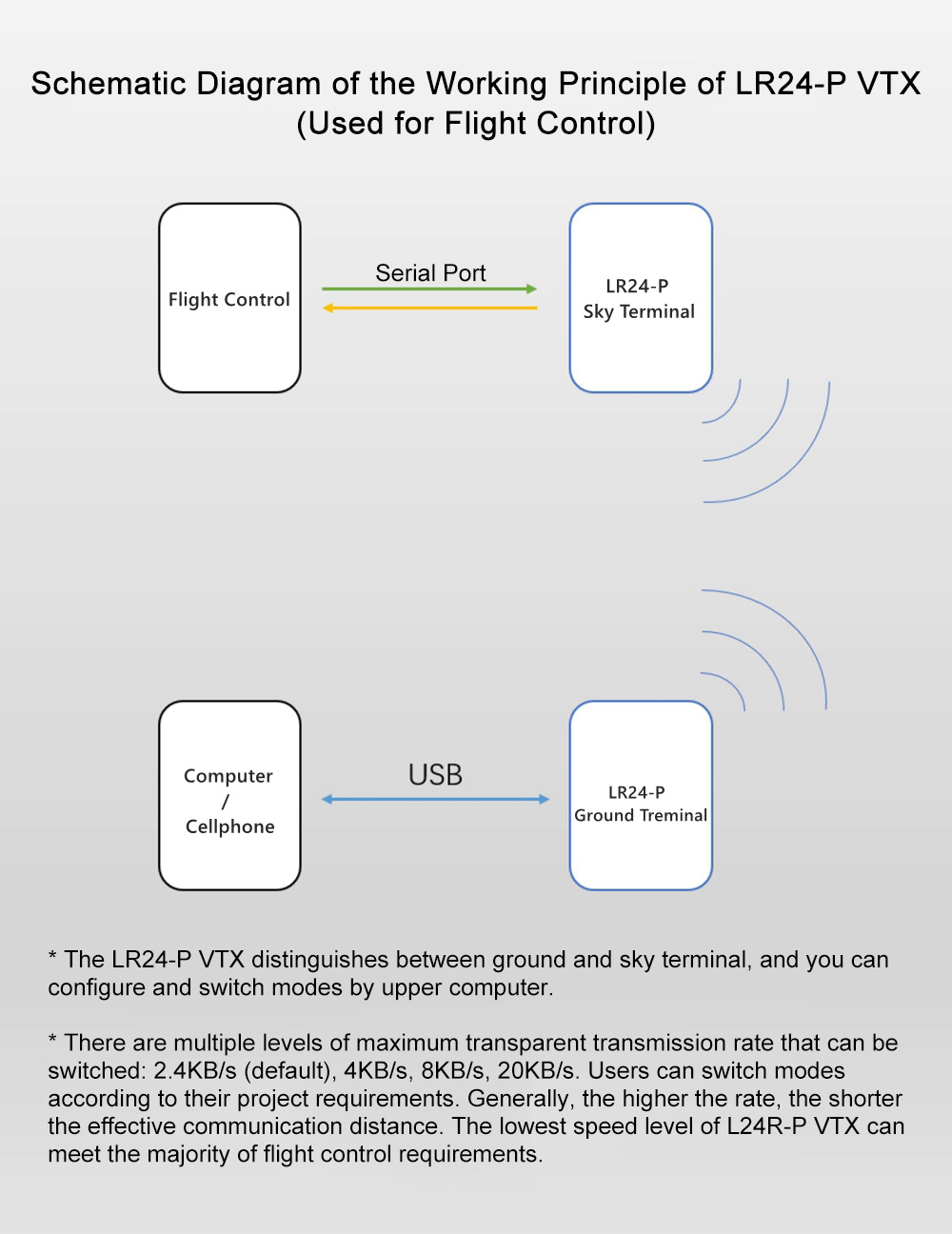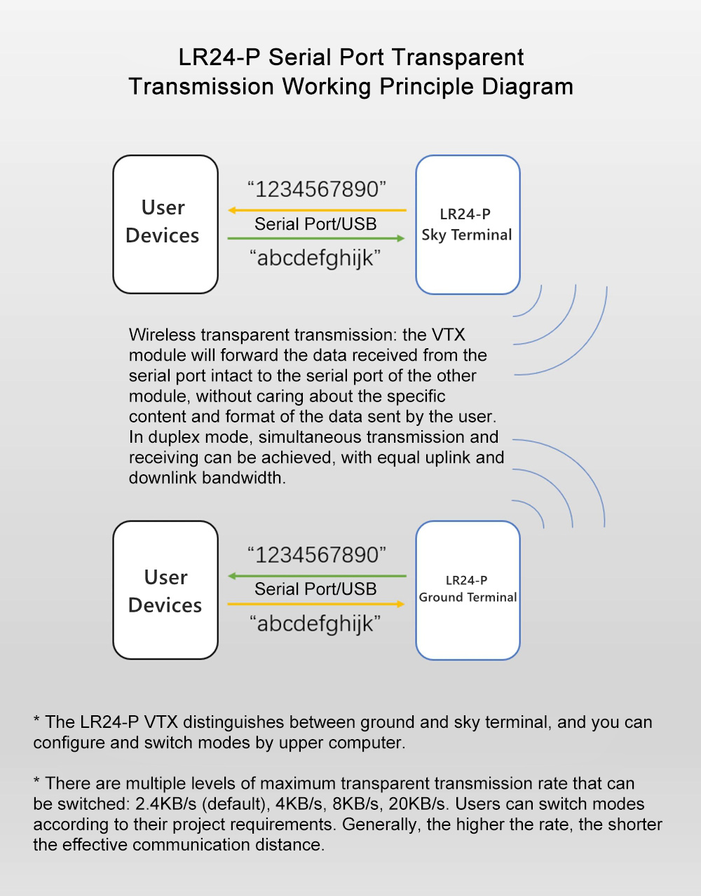 - The factory default configuration for LR24-P data transmission is duplex, low-speed mode (2.4KB/s) with a baud rate of 57600.