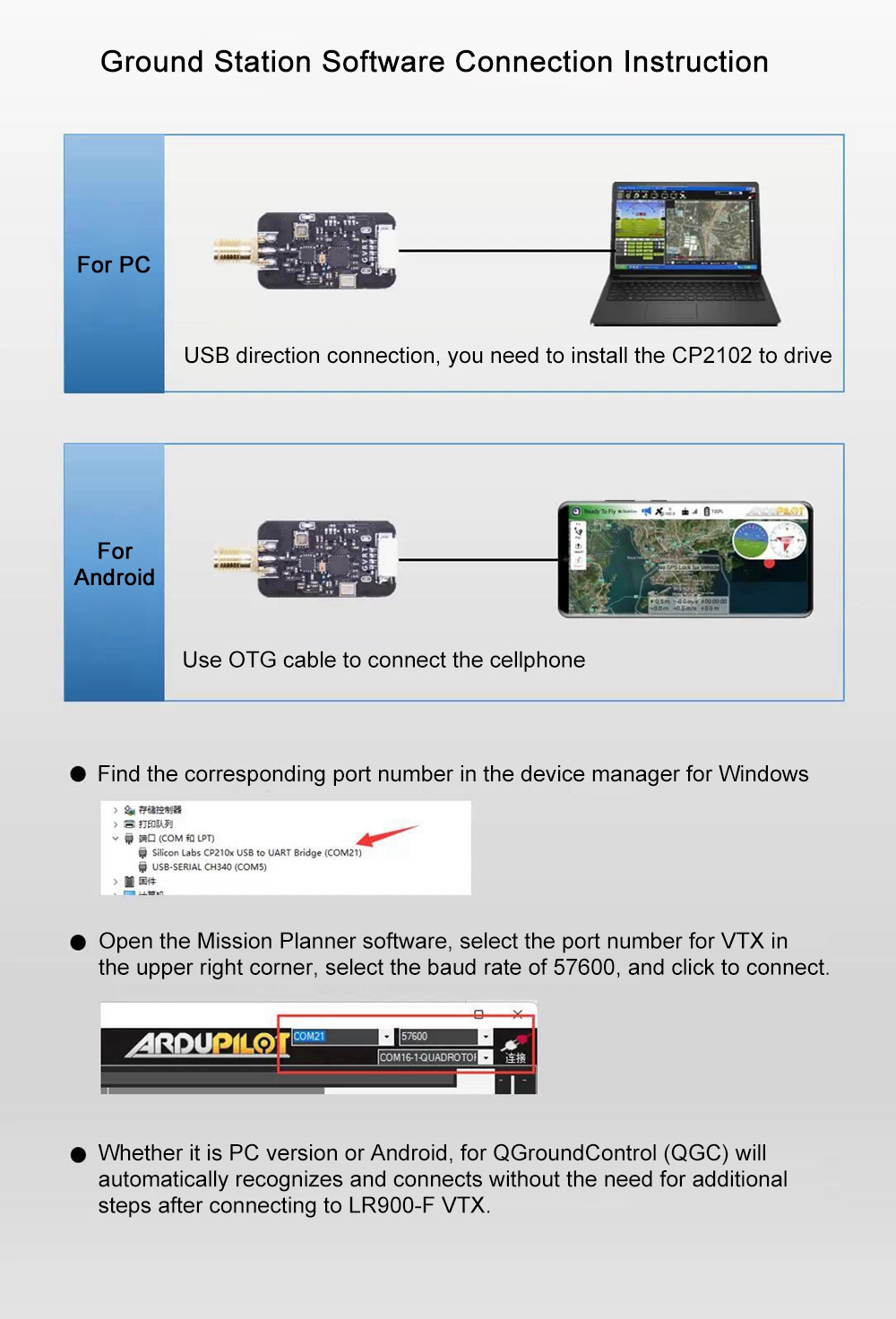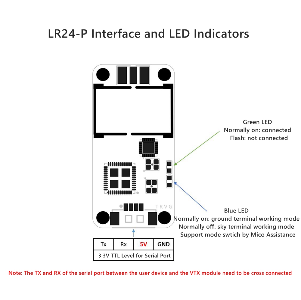 - Data pairing: As long as the parameters of two arbitrary data transmission modules are consistent, and one side is the ground terminal and the other side is the air terminal, they can automatically pair and communicate after being powered on. A green light on the VTX module indicates that it has been successfully connected.