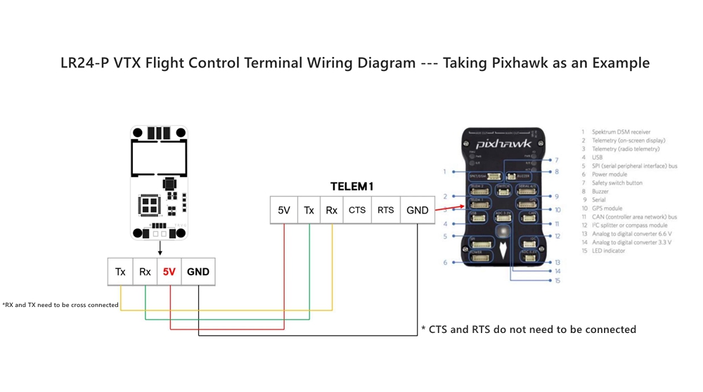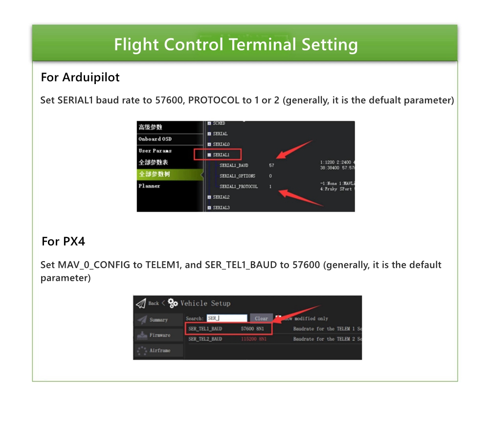- Confirm that the data transmission has been correctly connected to the flight control data transmission serial port, using the "TELEM1" interface as an example.
