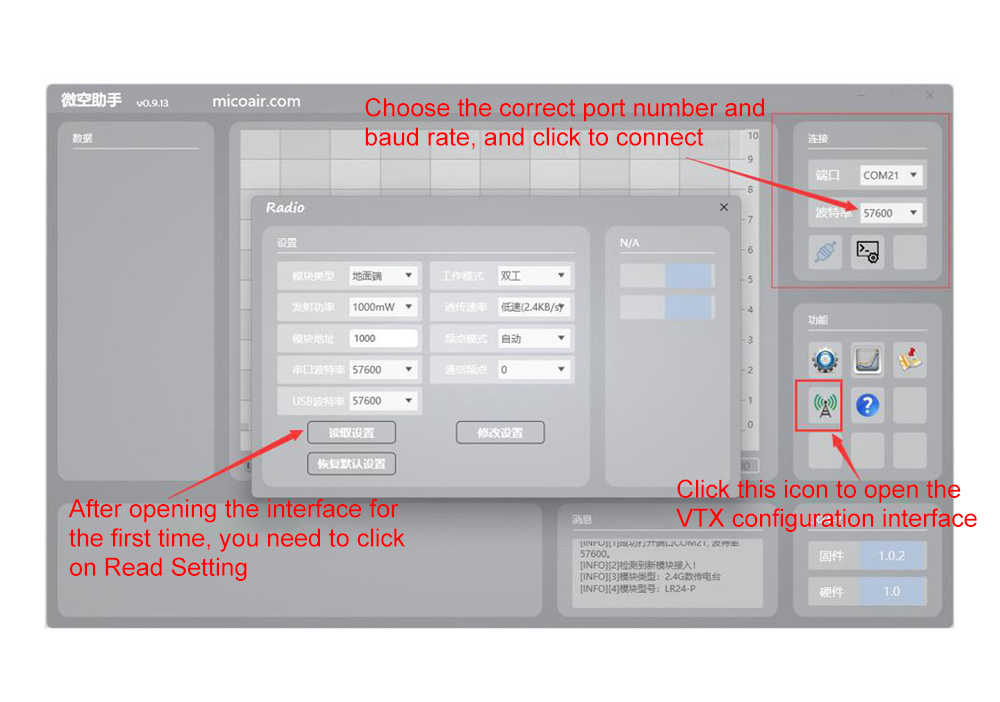 - You can use the Micoair Assistant software (supporting for WIN10/11) to modify the parameters of the configuration VTX module.