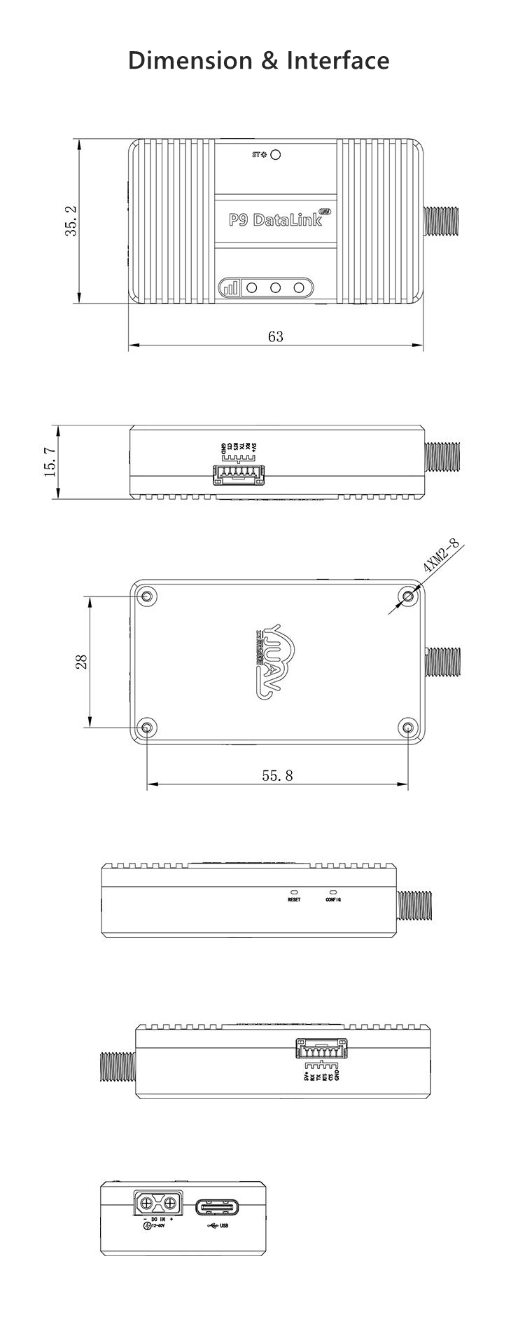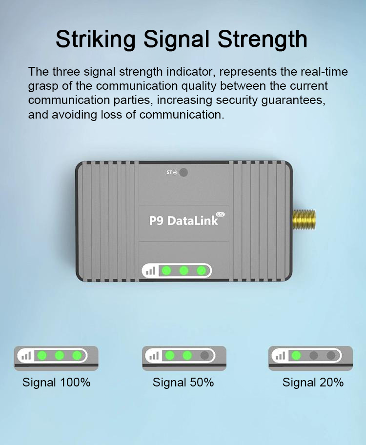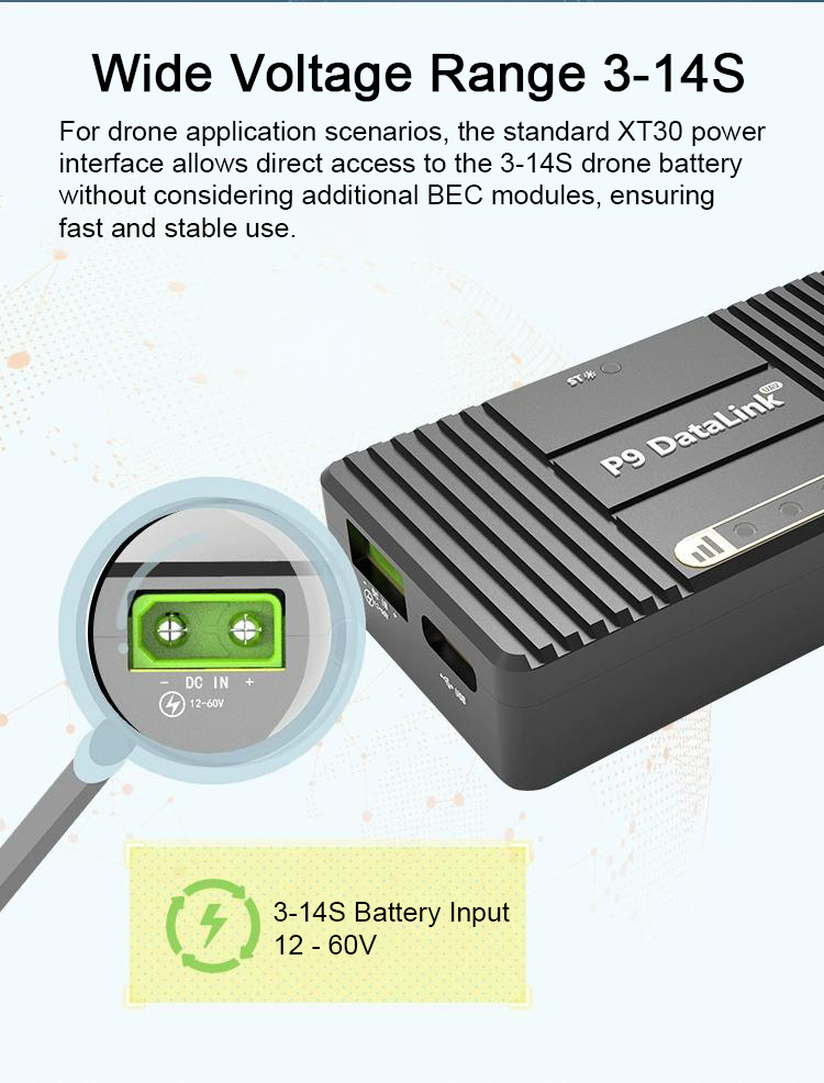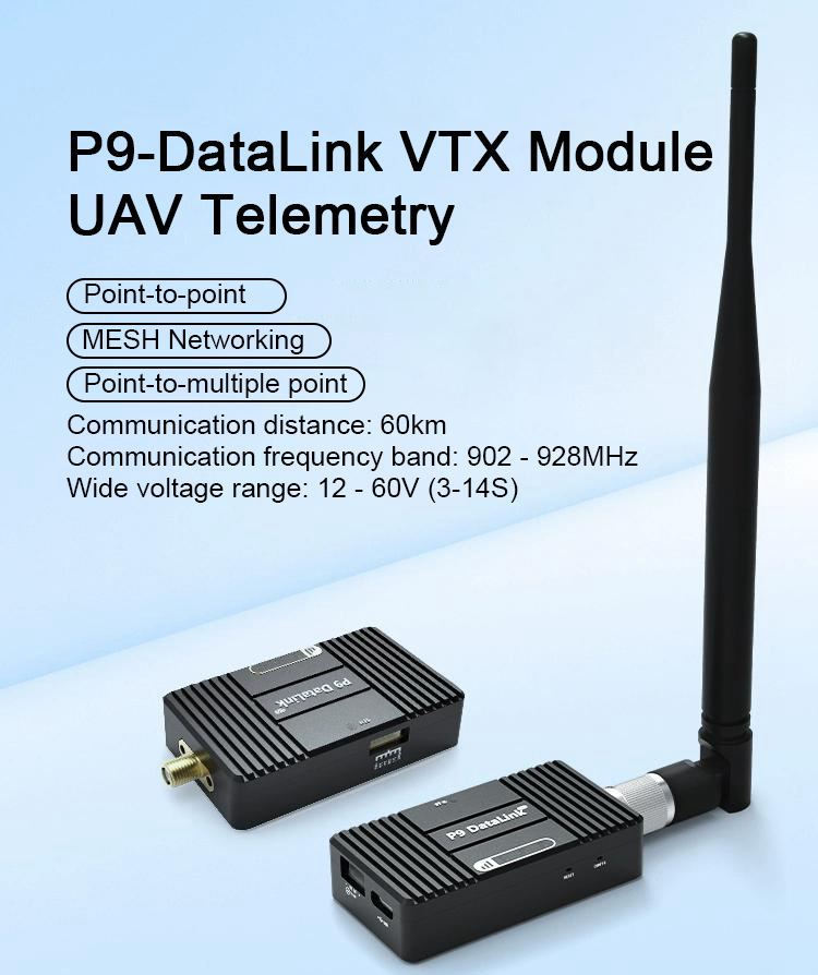 - P9-DataLink VTX module is an ultra-long range data transmission module with 902-928MHz communication frequency band, 60km communication distance and maximum 276kbos transmission speed rate.