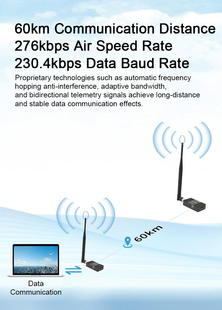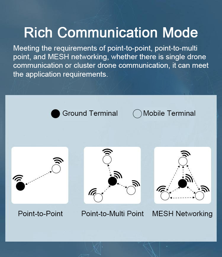 - Stable data transmission, millisecond level communication, widely used in the field of UAV communication.