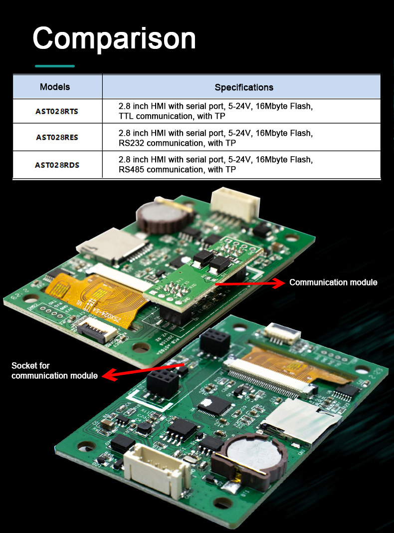 - Optional communication port: AST028RTS: One TTL serial communication; AST028RES: One RS232 serial communication; AST028RDS: One RS485 serial port communication
