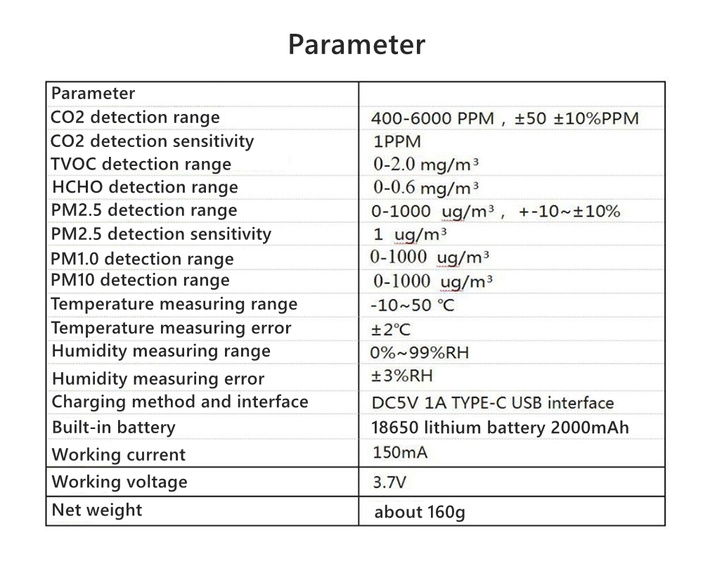 - CO2 detection range: 400-6000PPM, ±50±10% PPM