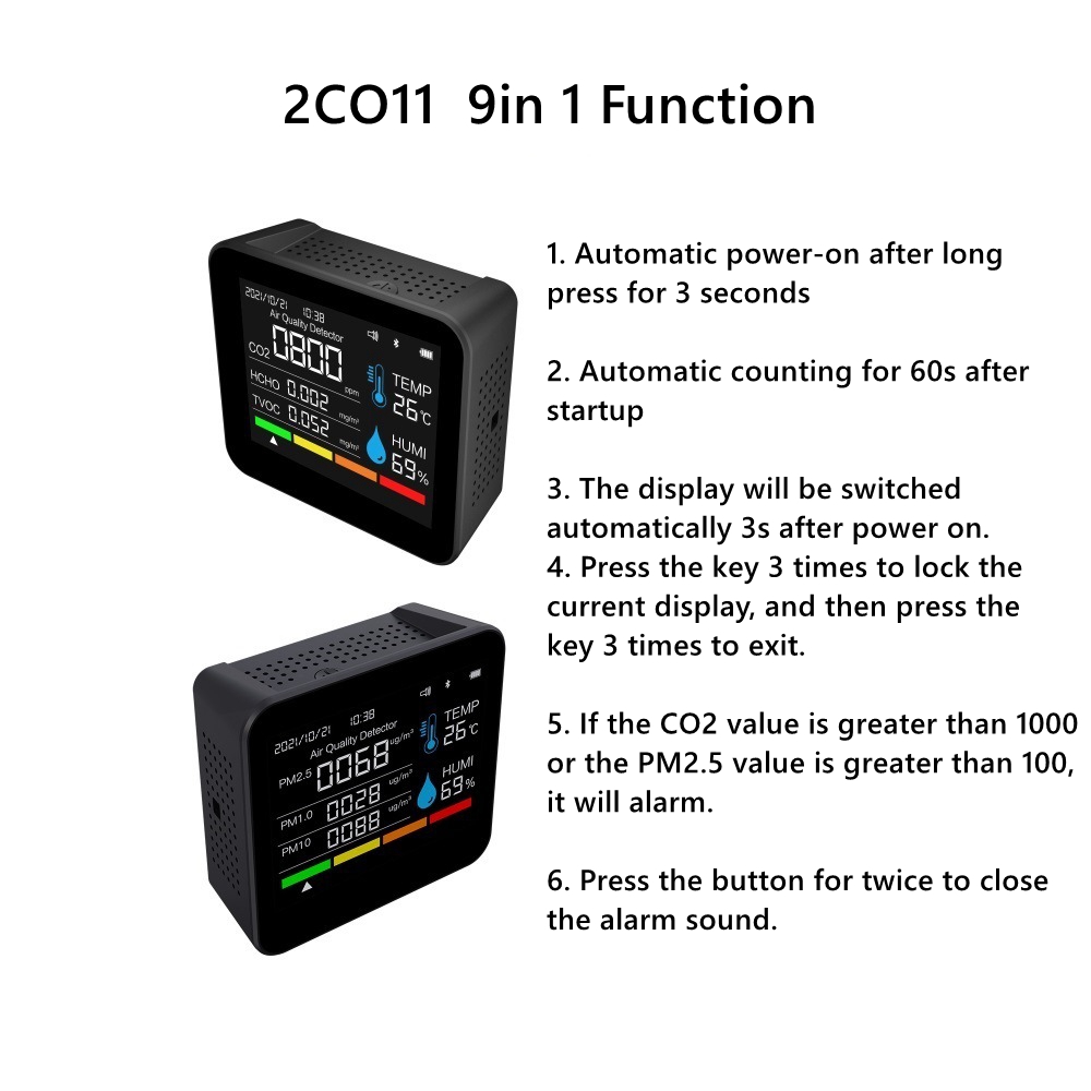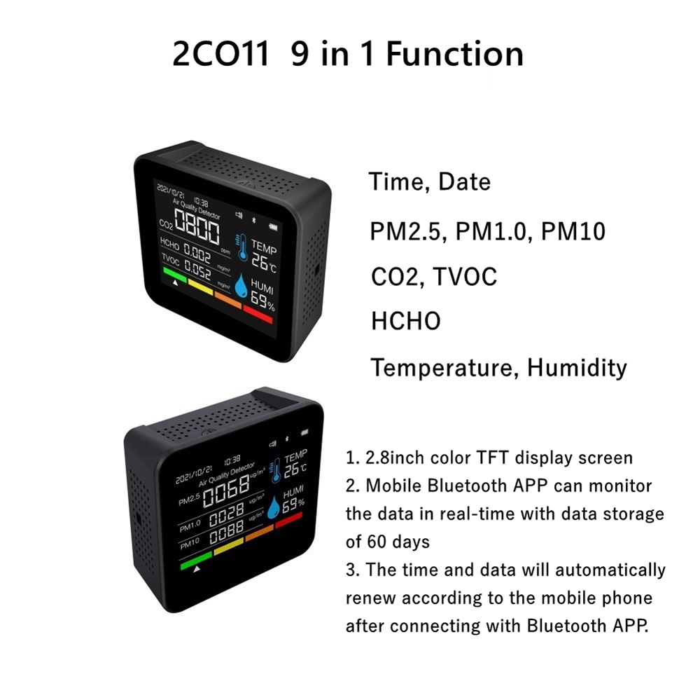 2CO11 Black 9 In 1 Air Quality Detector with Bluetooth Function for CO2 / TVOC / HCHO / PM2.5/1.0/10 Detection