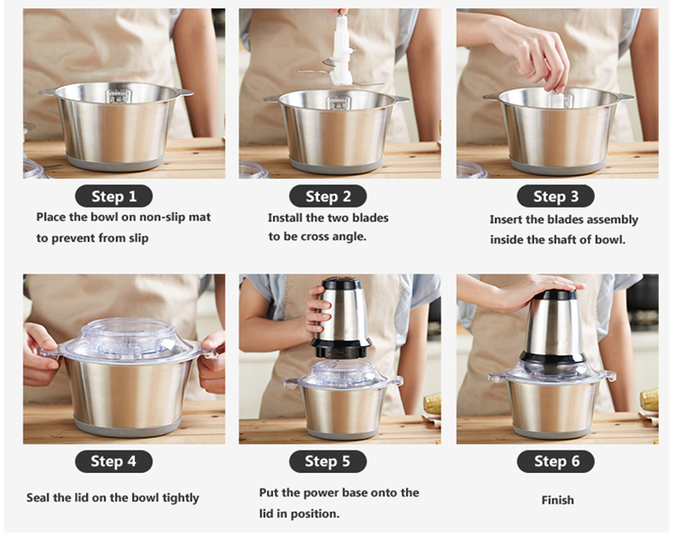 VERY IMPORTANT: The machine can work ONLY when the motor base installed correctly and tightly onto the cover of bowl !!