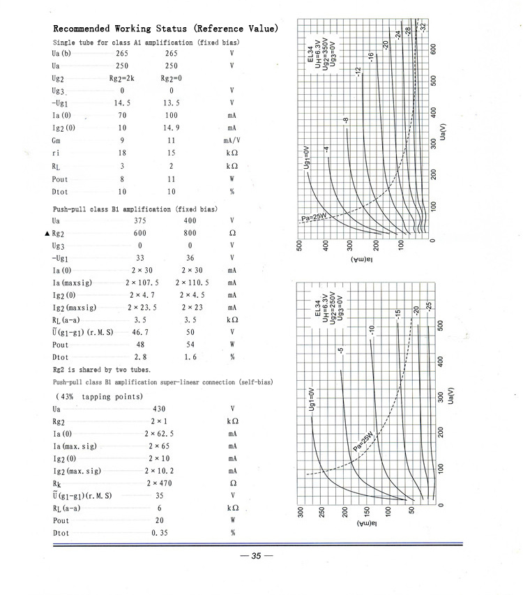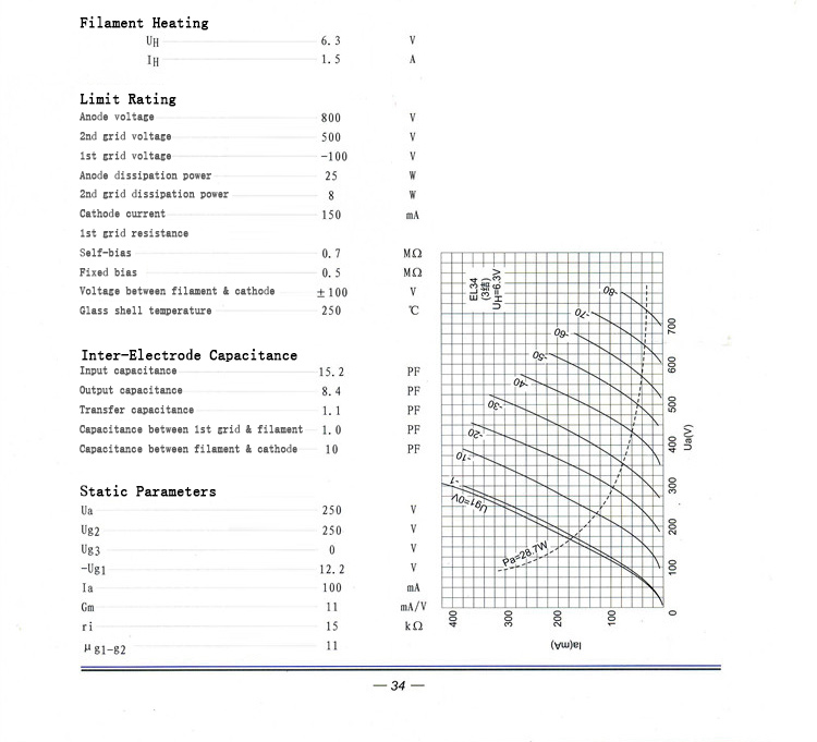 EL34 is a high-performance audio output pentode, and its anode limit dissipation power is 25W. In audio amplifier, the output power is greater than 10W when the single tube is used for class A1 amplification, and the output power is greater than 35W when the double tube is used for class AB1 amplification. EL34 is similar to 6CA7 and can be used interchangeably. EL34-B enables g1 and g2 accurate grids. It belongs to the beam-emitting pentode, and this type of tube is suitable for the manufacture of power amplifiers with moderate power. Also suitable for super-linear circuits. Compared with KT88, its timbre is more delicate and sweet, and its expressiveness is stronger. The board consumption of EL34-B can reach 30W.