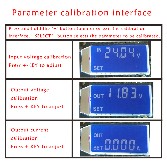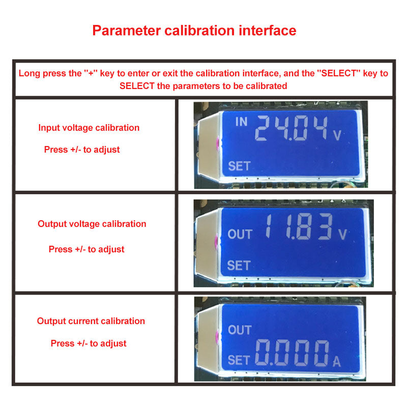Output current calibration: Press and hold "+" key to enter SET interface. The current display is input IN voltage. Press "SELECT" button once to switch to OUT voltage display. Press "SELECT" button again to switch to display output current interface. After short-pressing "+" or "-" key to adjust, press and hold "+" key to exit SET interface. Attention: Calibration is more accurate when current is greater than 1A. When output current is less than 0.05A, display error is large. When output current is less than 10-40mA, it may not be displayed.