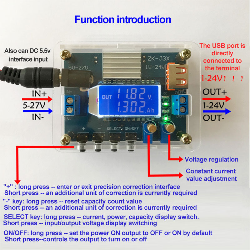 1. Input voltage: 5-27V (The input voltage needs to be higher than output voltage by 2V. If you want to output 5V, input voltage must be above 7V. When output voltage cannot be adjusted, it may be because the position of the potentiometer is higher than input voltage. You can first adjust CV potentiometer counterclockwise twenty turns to see whether output voltage changes)