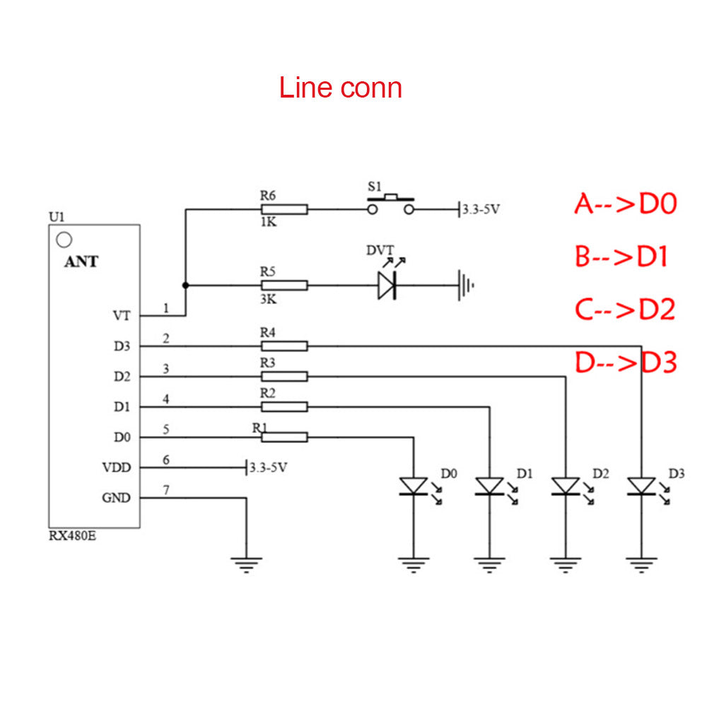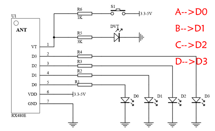 3.Interlocking: Press remote control, the corresponding channel of the decoding module continuously outputs a high level signal, and forces other channels to output a low level. (For example: Press A key on the remote control, D0 pin of the decoding module outputs a high-level signal, and the other three channels output a low level. Press B button, D1 pin of the decoding module outputs a high-level signal, and the remaining three channels output low level signal.)