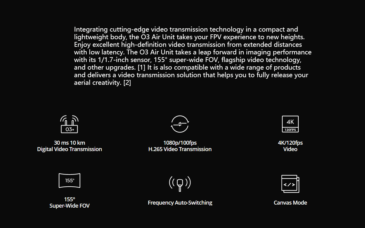 The O3 Air Unit features a video transmission resolution of up to 1080p, while maintaining a high frame rate of 100 fps. It also supports the H.265 video coding format, presenting additional clarity and smoothness in your live view.