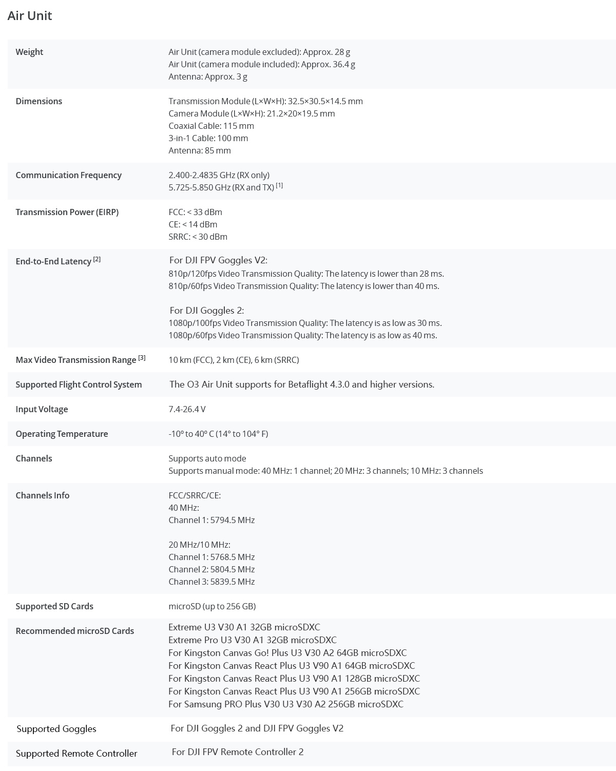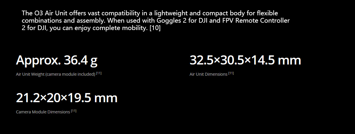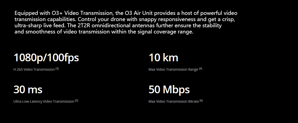 5. Tested in an outdoor open environment free of interference. Video transmission latency data varies with different goggles. With Goggles 2 for DJI at 1080p/100fps video transmission quality, the lowest video transmission latency is 30 ms. With FPV Goggles V2 for DJI at 810p/120fps video transmission quality, video transmission latency is less than 28 ms.