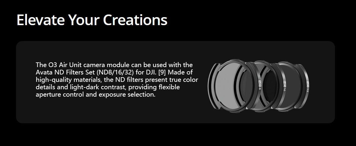 The O3 Air Unit features upgraded imaging specs across the board. The air unit camera module is equipped with 20 GB of built-in storage as well as a 1/1.7-inch sensor to present richer details and high-quality imagery. It supports 4K/120fps video and shoots 155° super-wide FOV footage for stunning visual effects. [8] In addition, D-Cinelike color mode provides more creative freedom for color grading, allowing you to more flexibly edit and adjust your footage.