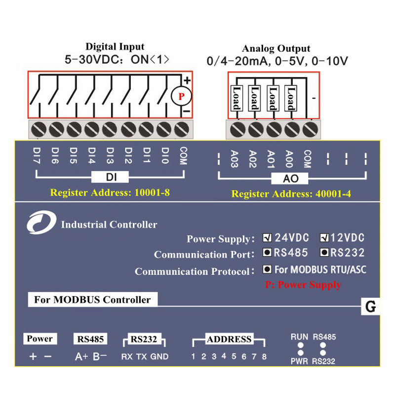 4AO + 8DI Data Acquisition Industrial Controller 0-20mA/4-20mA 0-5V/0-10V RTU-307K [RS232 RS485]