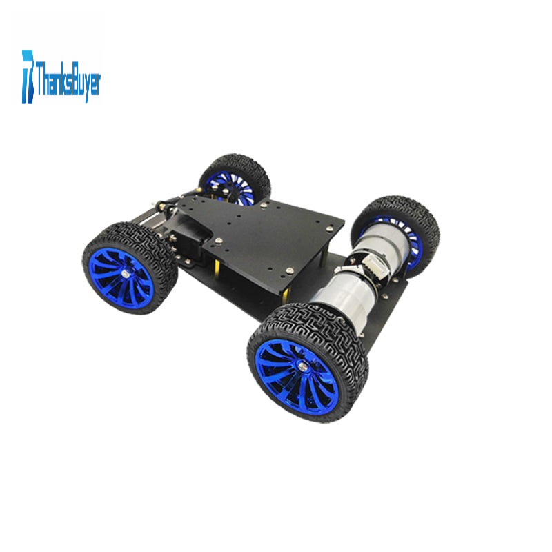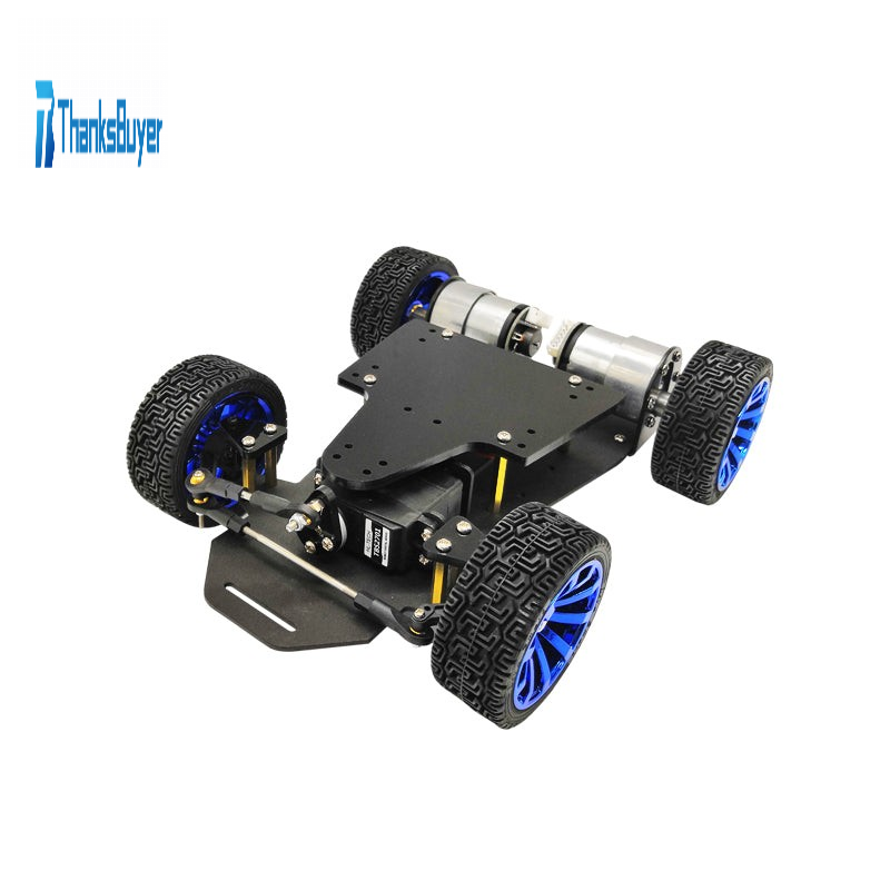 This is a newly designed 4-wheeled car chassis that is different from those with an ordinary 4-wheel drive. The car's rear-wheel drive plus front steering mechanism allows the car to move forwards, backwards and left and right.