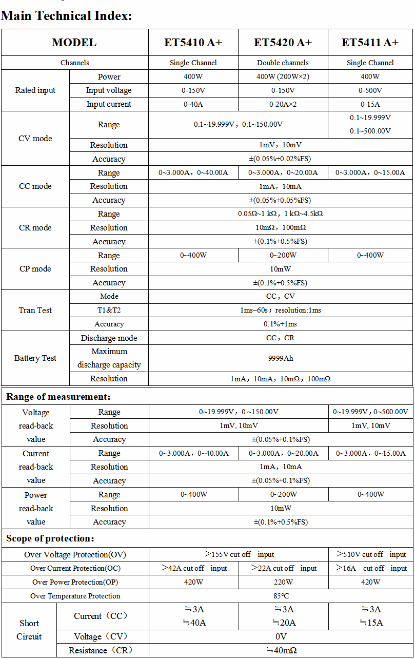 500V 15A 400W Programmable Load One-Channel DC Electronic Load of High Resolution Precision ET5411A+