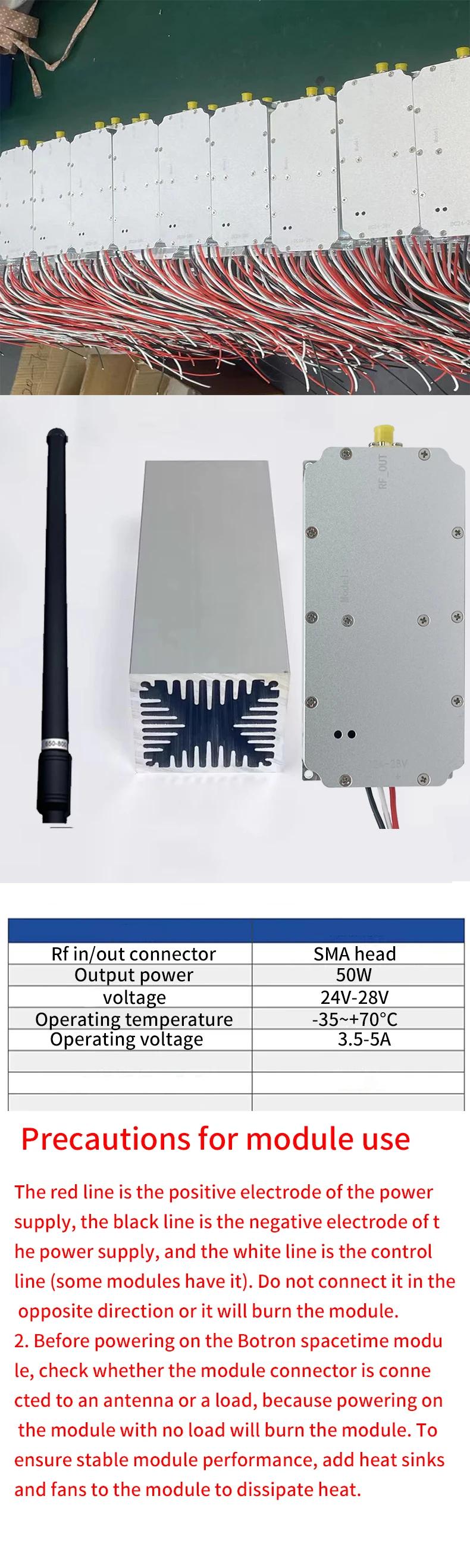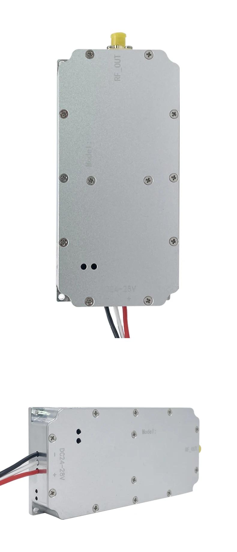 - This product is an information security module specifically designed to block the signal transmission of unmanned aerial vehicle ground stations. This module has the advantages of an average output power of 50dBm (100W), sufficient power, good flatness in the band, and small offset between the upper and lower side-bands. The product is equipped with running indicator LED lights, the efficient frequency interference source temperature drift is very small, and is easy to apply. The frequency hopping drone has good countermeasures.