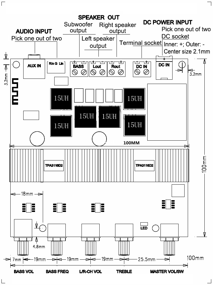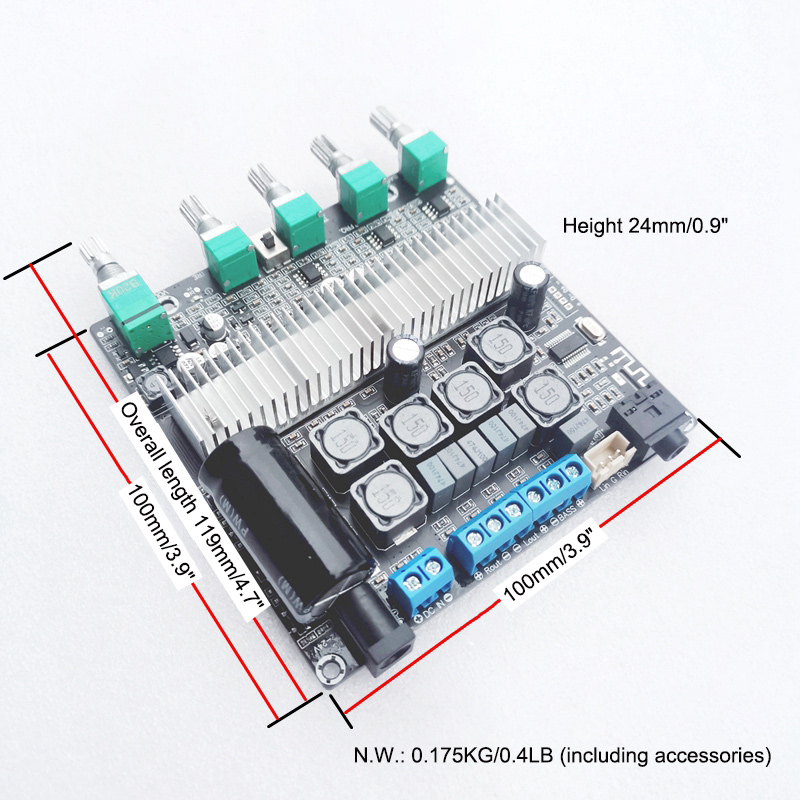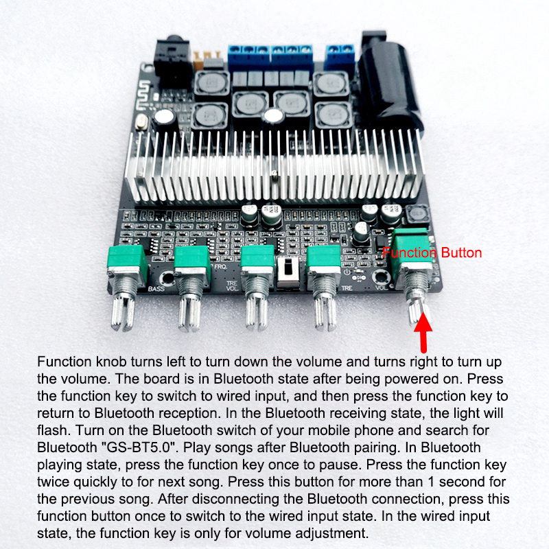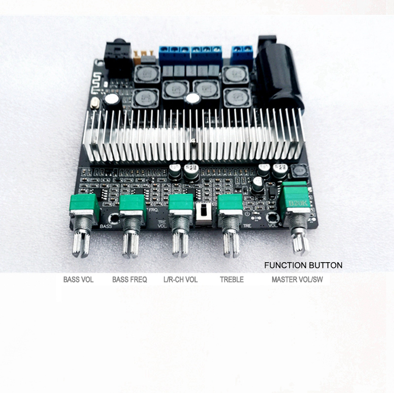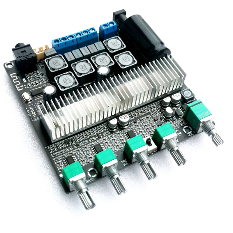 It supports Bluetooth audio reception. It has sound source input interface, preamp and bass frequency division processing technology. There are 5 potentiometers: bass volume, bass frequency, left- and right-channel volume, treble, mater volume/switch.
