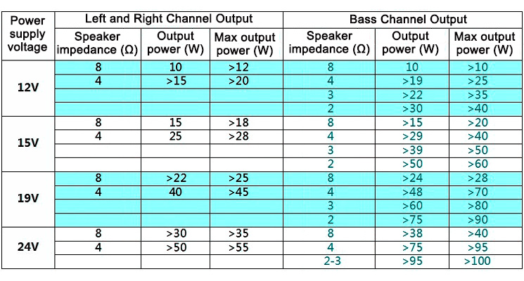- Speaker impedance: left and right channels: 2-19 ohms; Bass channel: 2-16 ohms for 10W-300W speakers