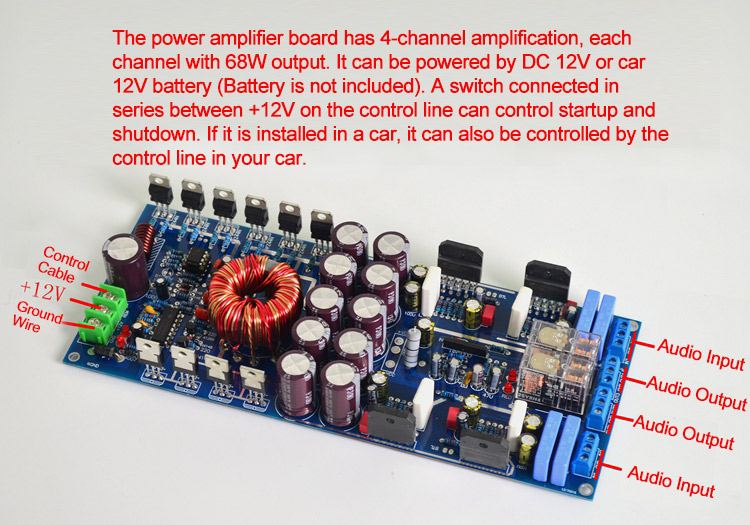 - This power amplifier board takes LM3886TF as the core and adds a step-up transformer conversion circuit. Just use DC 12-14 to make it work. It can be used in a car to works as a HiFi car power amplifier. Four independent amplification, and with a complete output protection circuit, midpoint detection circuit, switch delay circuit. It outperforms ordinary car power amps in tone and performance.