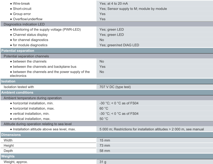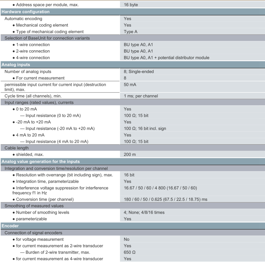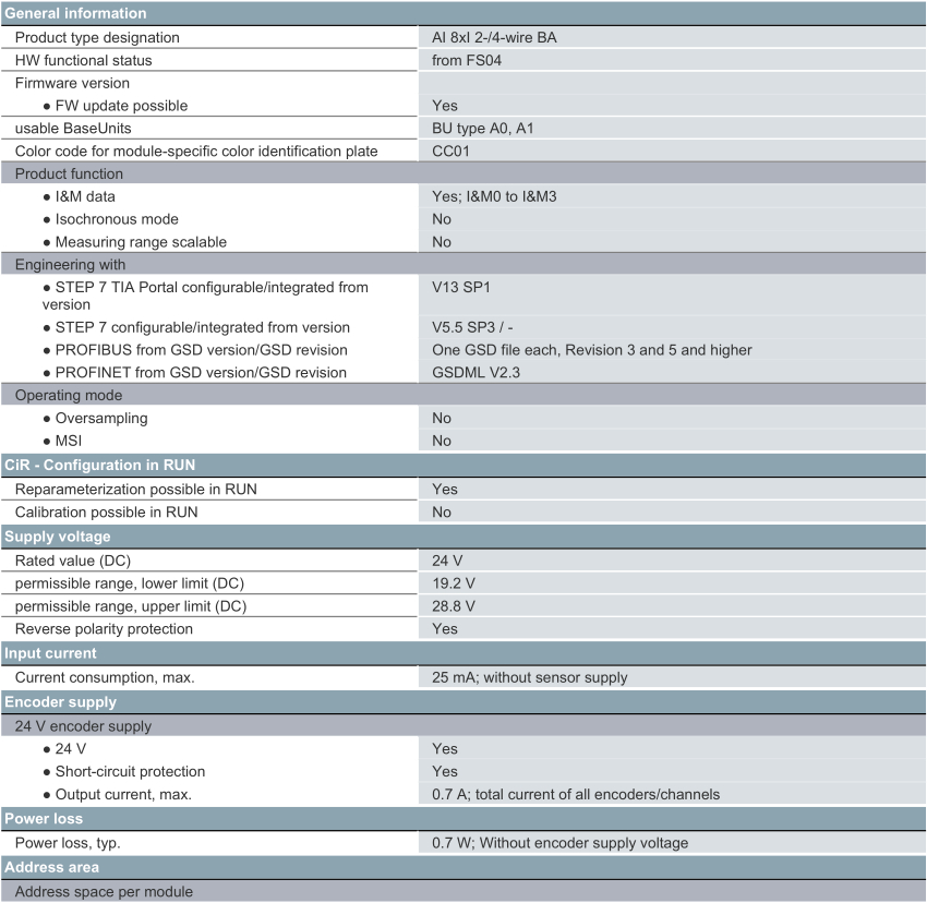 ET 200SP for SIMATIC, Analog input module, AI 8XI 2-/4-wire Basic, suitable for BU type A0, A1, Color code CC01, Module diagnostics, 16 bit