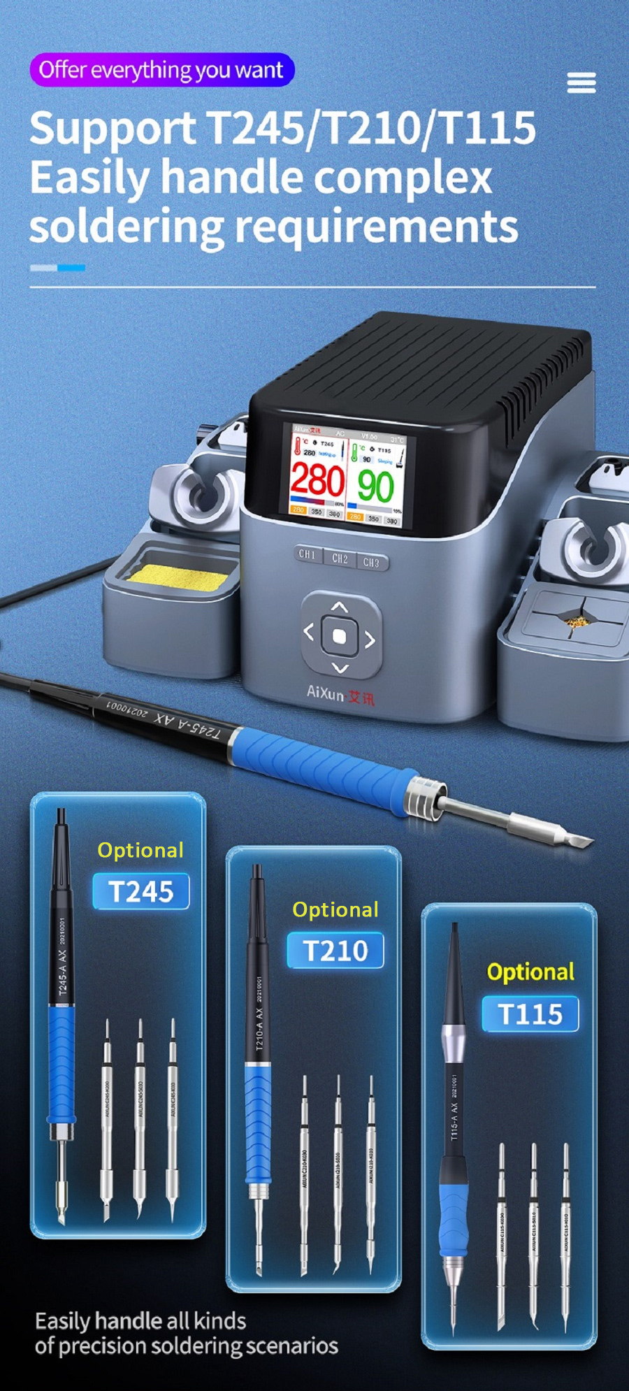 - Supports T245, T210 and T115 handles and soldering tips. Supports automatic identification of models and working status.