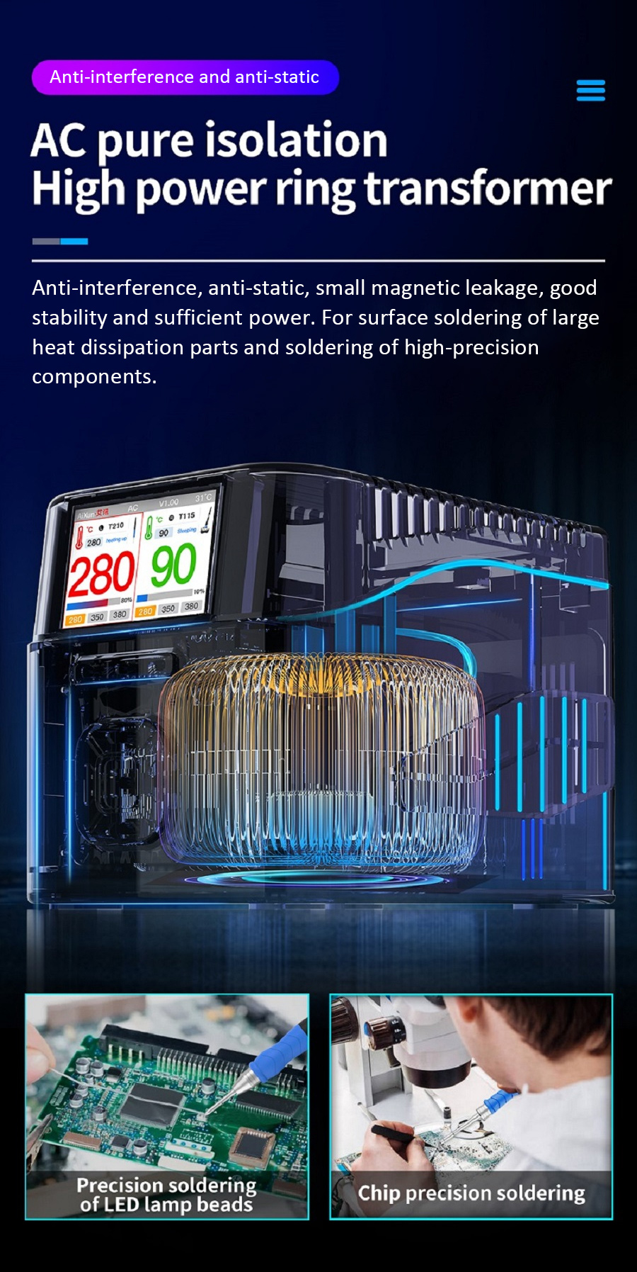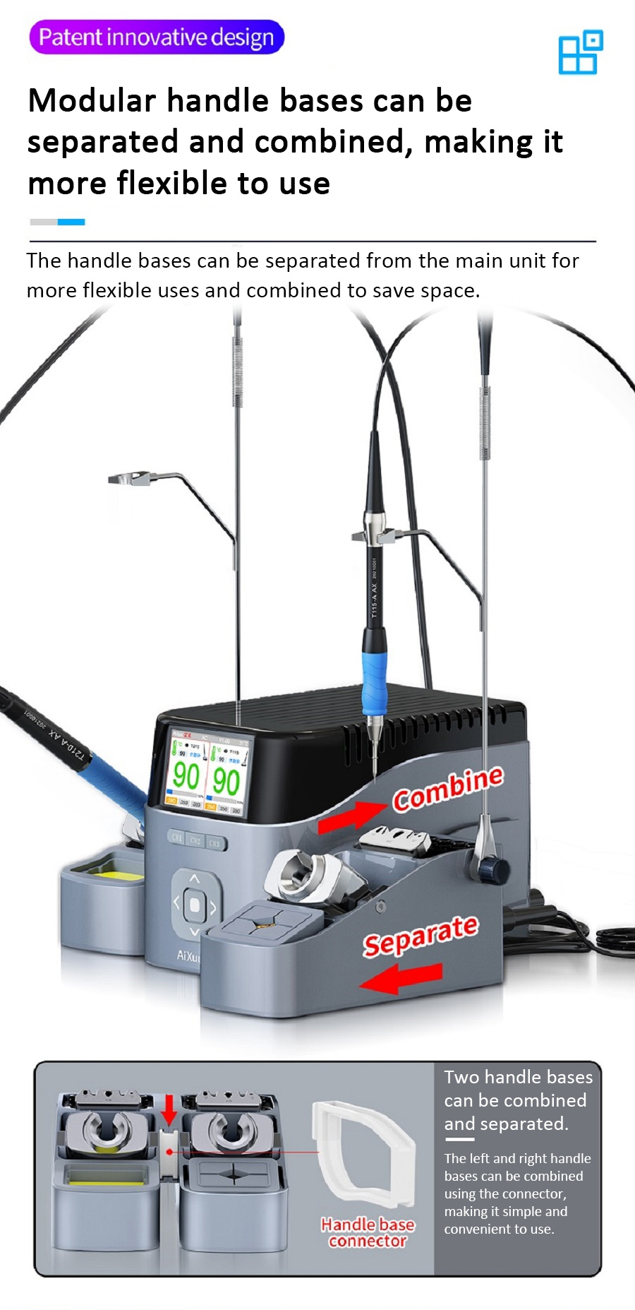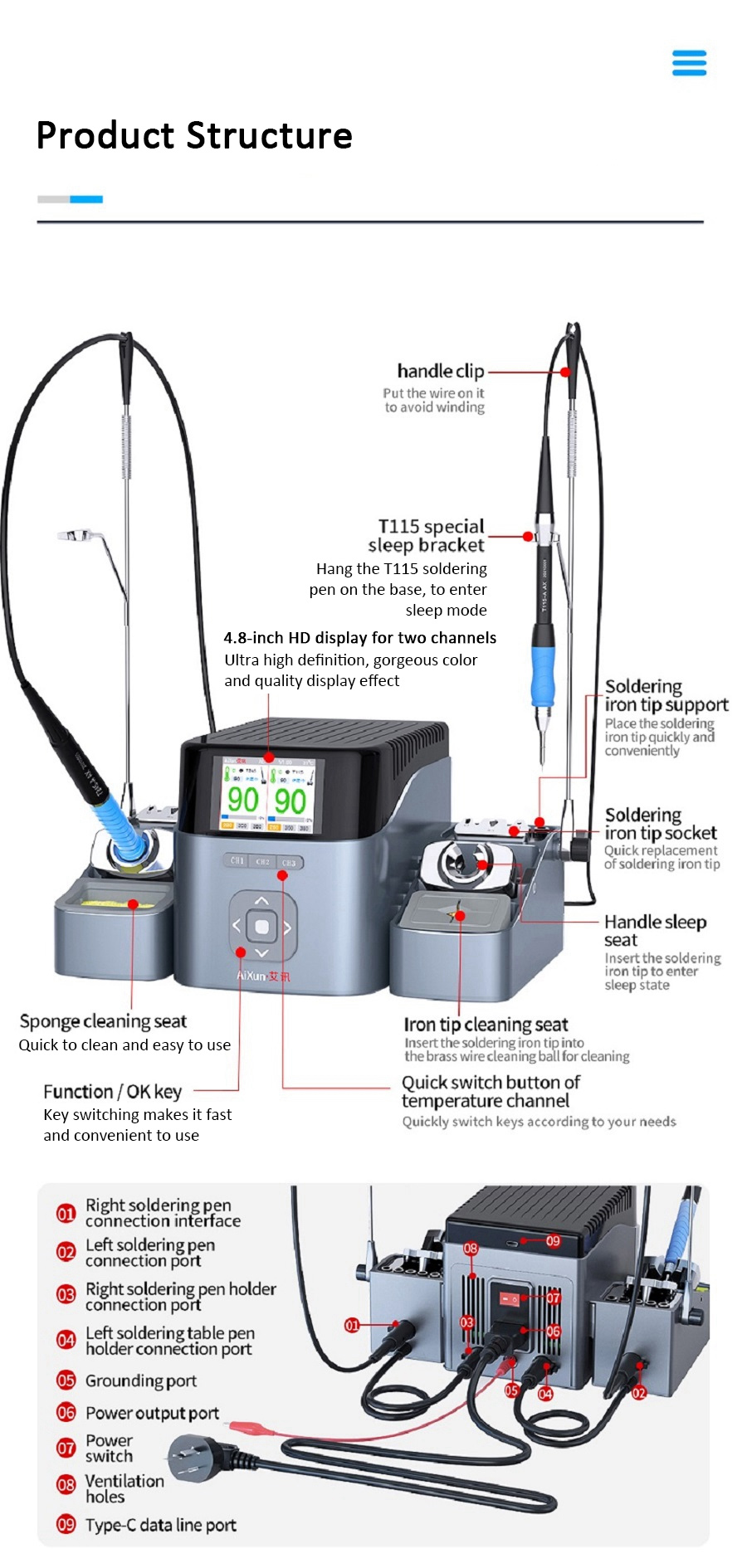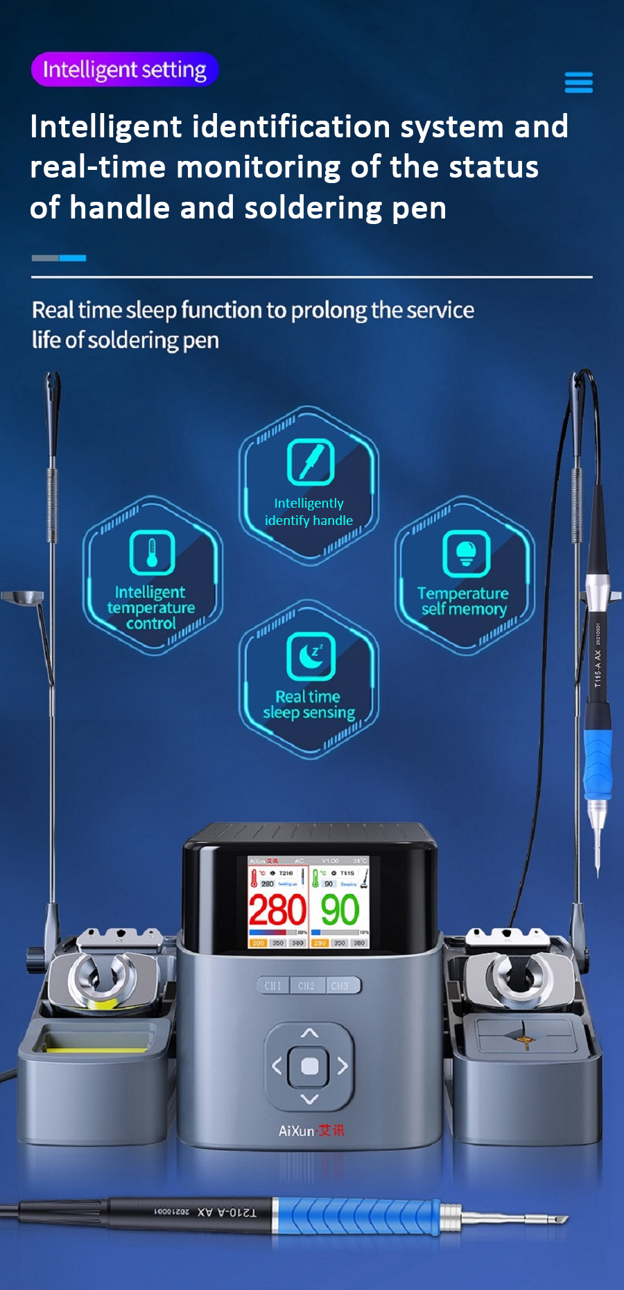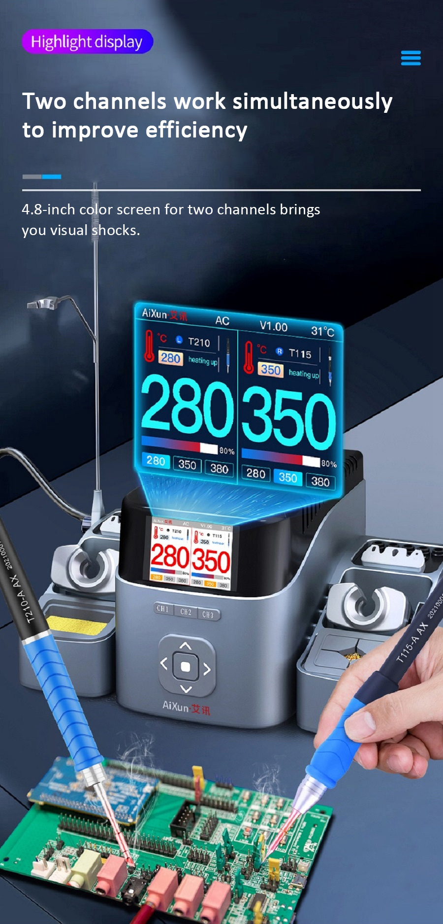 - Dual-channel intelligent soldering station. Two channels can work simultaneously