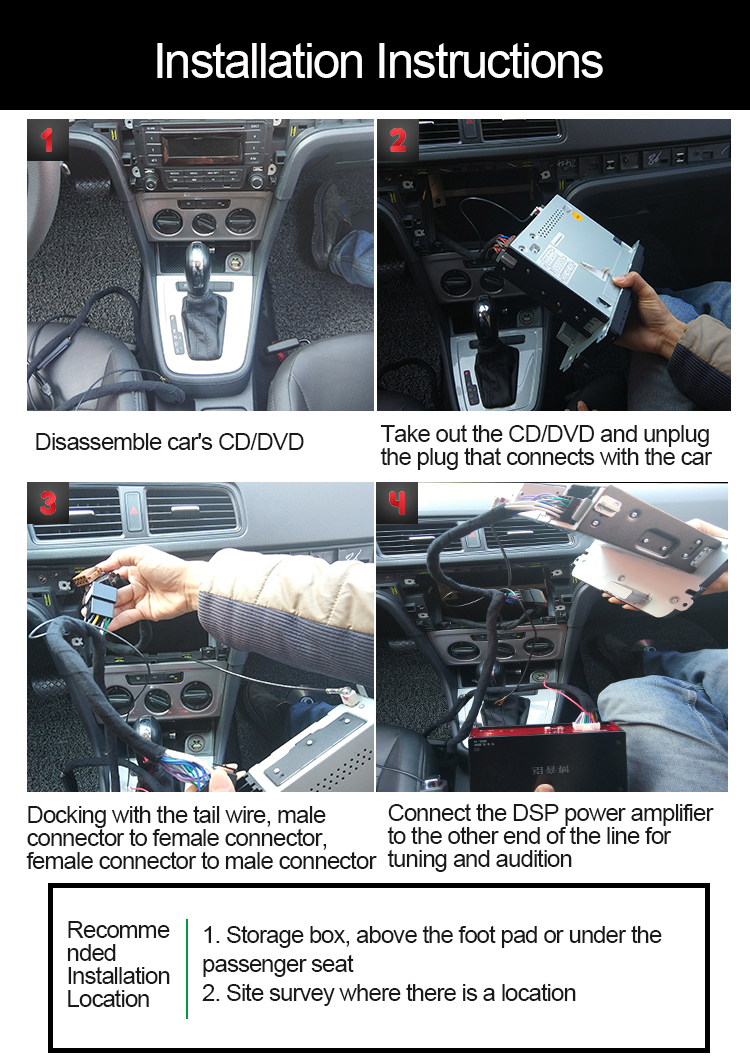 - DSP audio processor: careful post-adjustment. Aiming at the following problems of car audio: the treble is not transparent, unclear, and not delicate. The mid tone is muddy and vague, and the human voice has no emotion. The bass is dull and weak and not thick enough. Changed the navigation sound quality deteriorated, changed the speaker power is insufficient. The sound field of the original car stereo is disordered, and the sound has no three-dimensional sense of hierarchy.