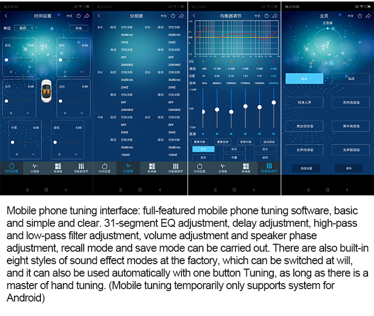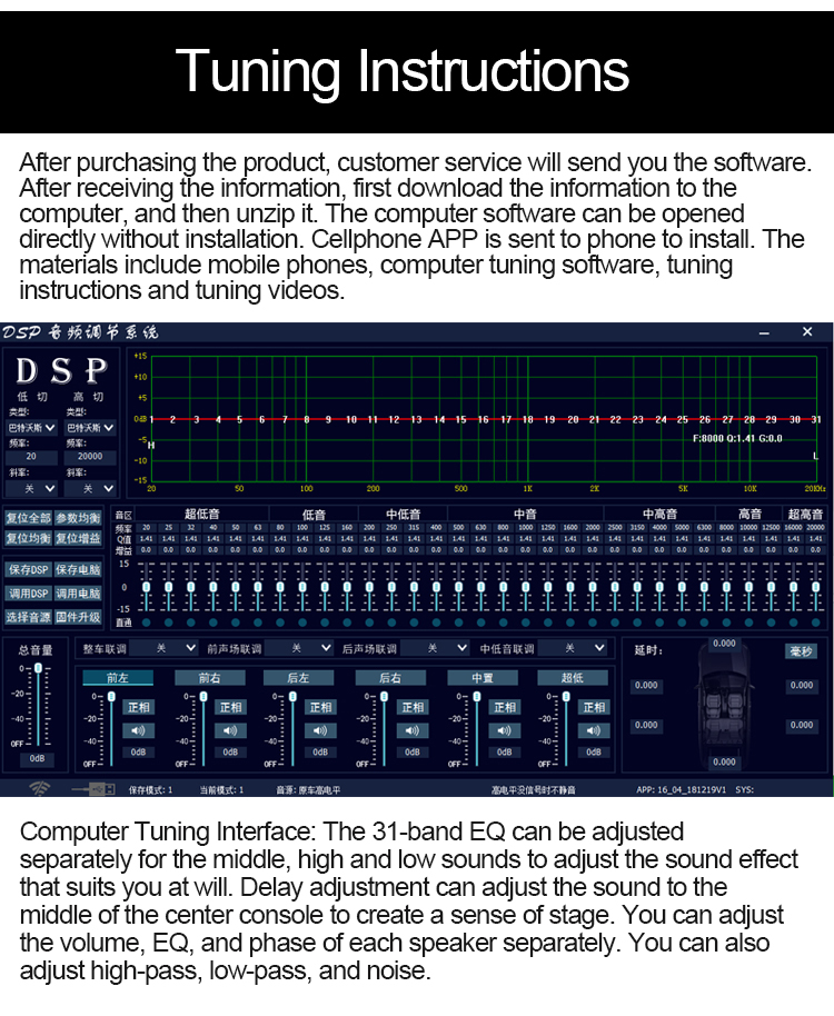 - 31-segment mobile phone, computer tuning, delay, sound field, phase, gain adjustments. Solve the problem that the sound field of the original car is disordered, with only mono, no three-dimensionality, and no layering.