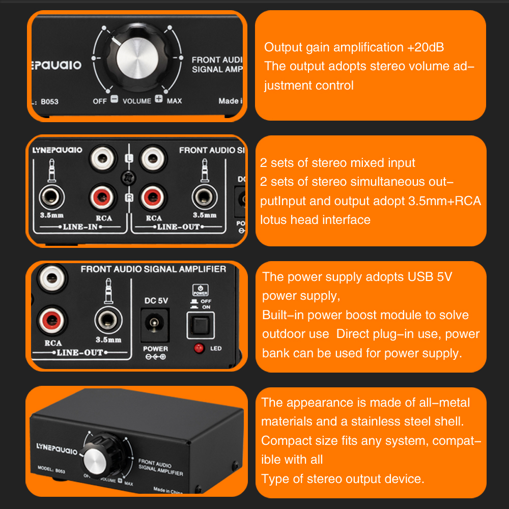 2. Best performance audio source signal amplifier with volume control: Adopt new sound source signal amplifier circuit architecture, output level signal gain +20dB