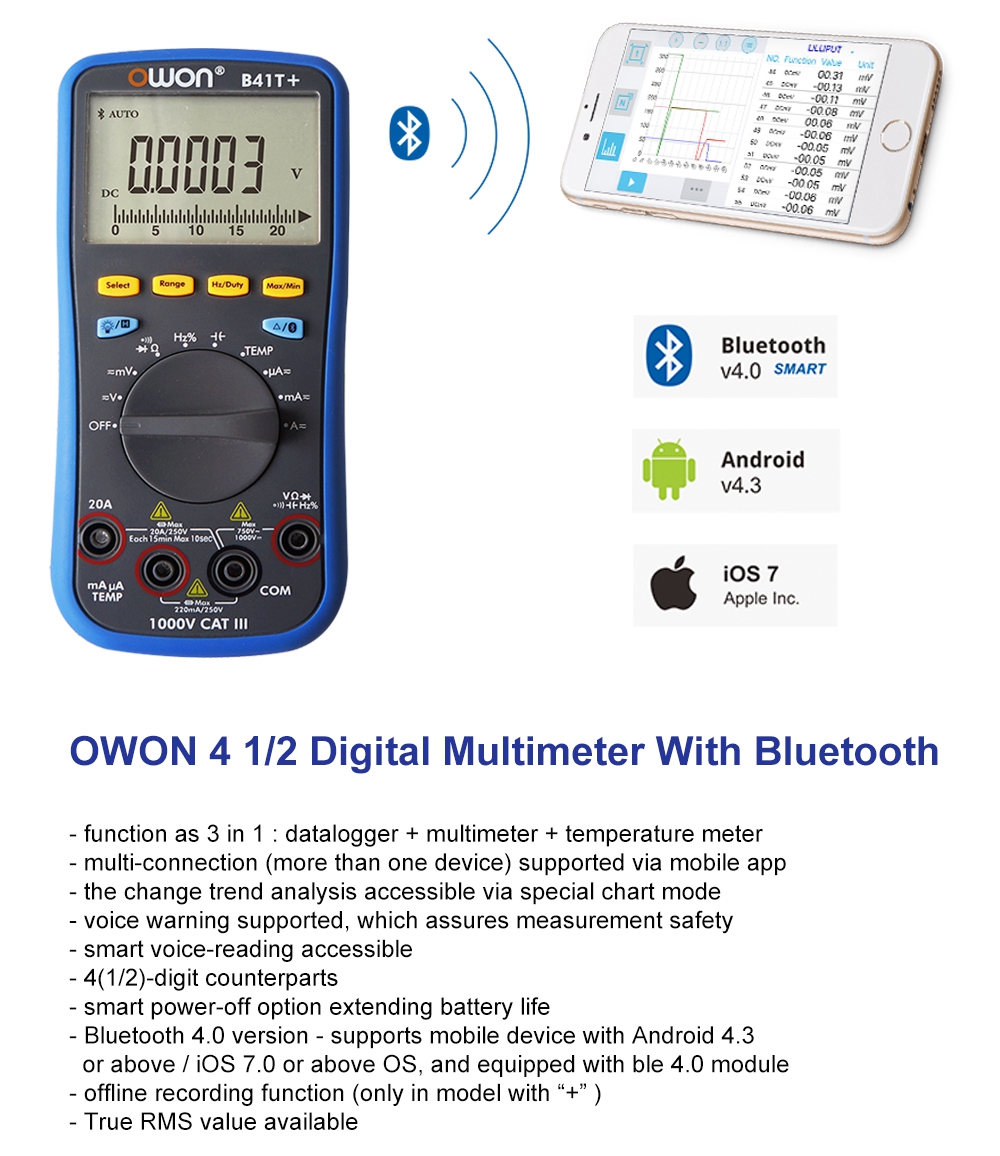 B41T+ 41 Series 4 1/2Bit Intelligent Bluetooth Digital Multimeter Datalogger + Multimeter + Temperature Meter for OWON