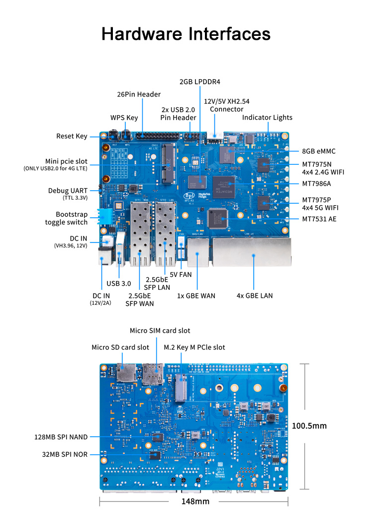 * Size: 100.5mmx148mm. Same as Banana Pi BPI-R64 and Banana Pi BPI-R2