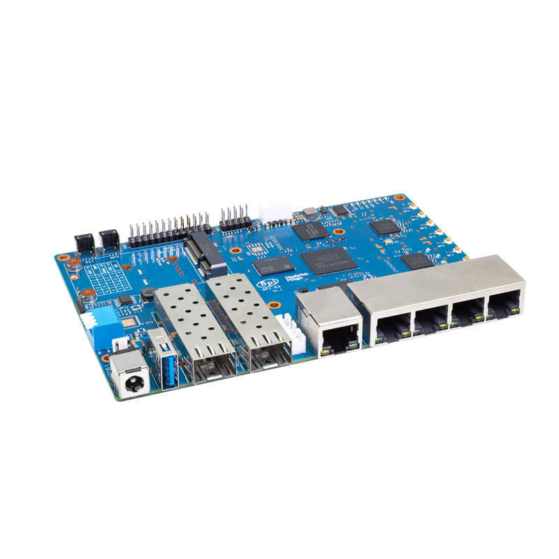 It is a very high-performance open-source router development board. It supports Wi-Fi6 2.4G Wifi with MT7975N and 5G Wifi with MT7975P. It also supports two SFP 2.5GbE ports and five GbE Ethernet ports.