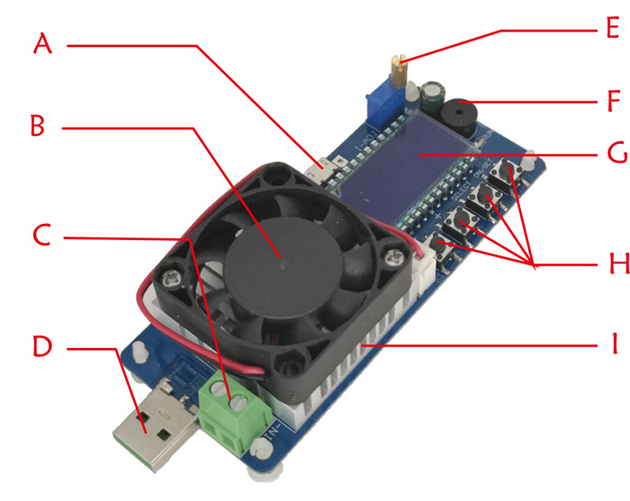 D: load USB input port (DC1.5V-25V)