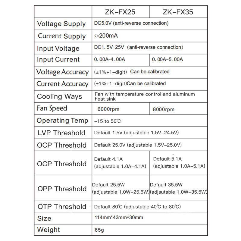 3.The voltage at the load input should be between DC1.5V-25V. Current should be below 4A (ZK-FX25) or 5A (ZK-FX35).