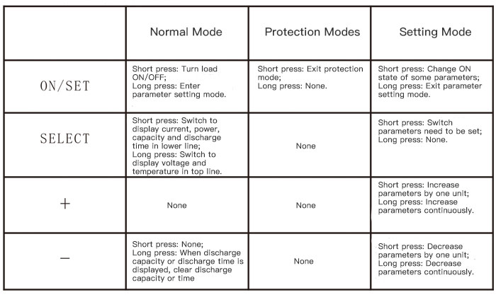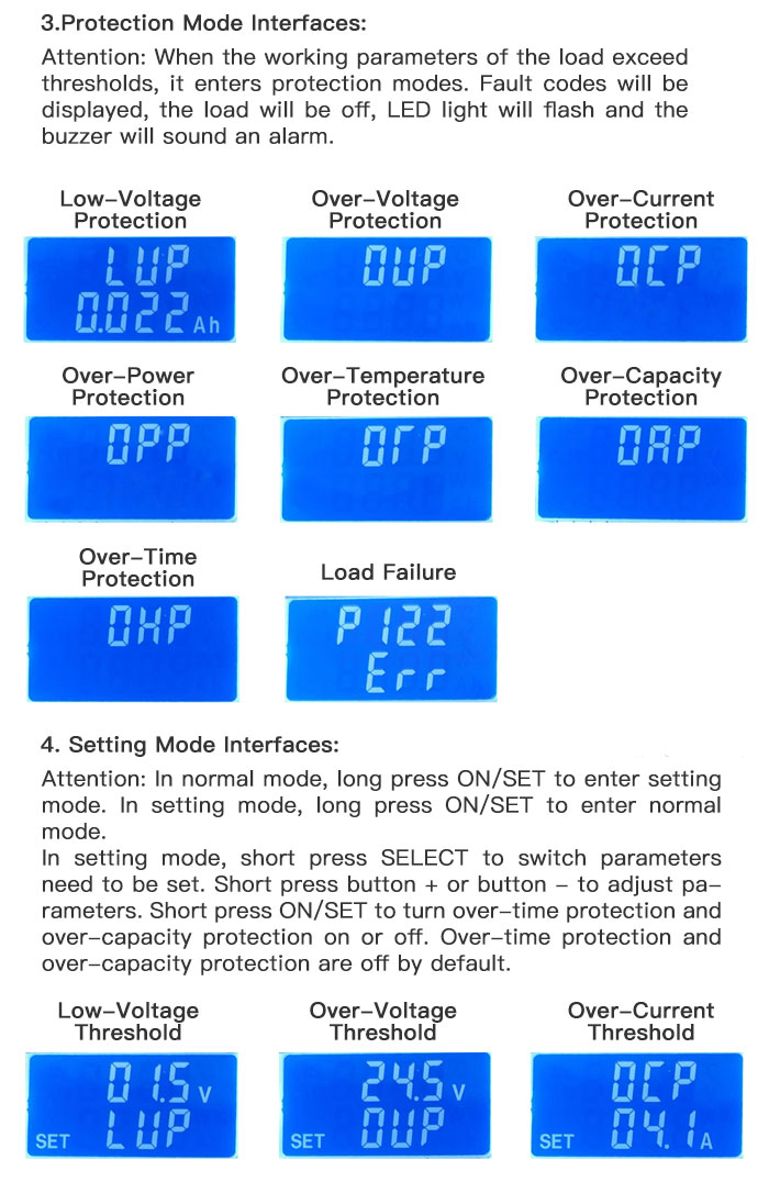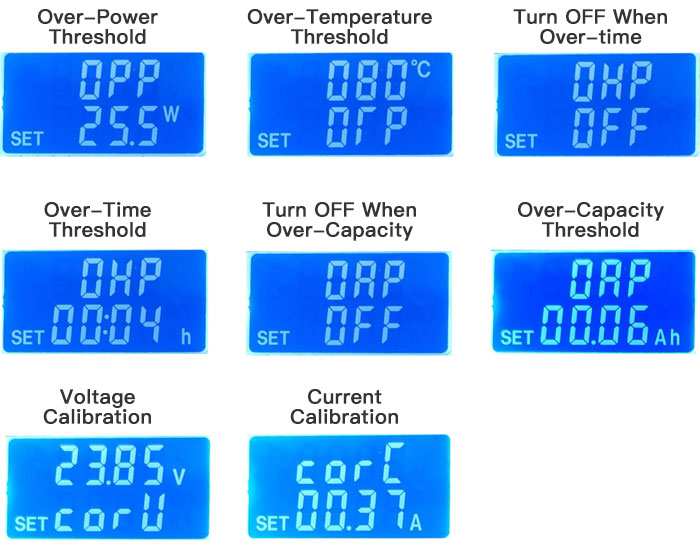 - To set under-voltage threshold, over-voltage threshold, current protection threshold, temperature protection threshold, power protection threshold, capacity threshold, and time threshold. Turn off time and capacity thresholds
