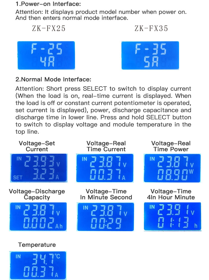 Working normally, LCD displays load input voltage and temperature in the first line. And displays load current, power, capacity and discharge time.