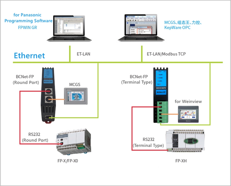 - BCNet-FP is an economical Ethernet communication processor, which is designed to meet the increasing needs of factory equipment informatization (equipment Network monitoring and production management). It is used for Panasonic FP-XH, FP-X, FP-X0, FP0, FP0R, FP2SH and other series of PLC Ethernet data acquisition, which is very convenient to build production management systems.